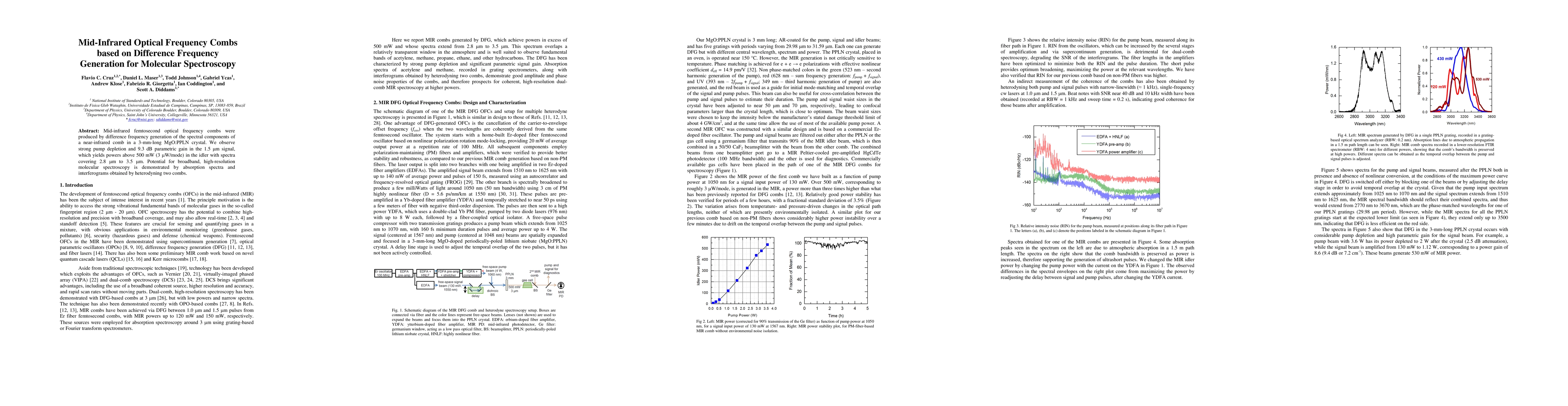Mid-infrared femtosecond optical frequency combs were generated via difference frequency generation in a MgO:PPLN crystal, achieving significant parametric gain and high signal power, demonstrating potential for high-resolution molecular spectroscopy. Spectra covering 2.8 to 3.5 µm were obtained, showcasing broadband absorption capabilities.