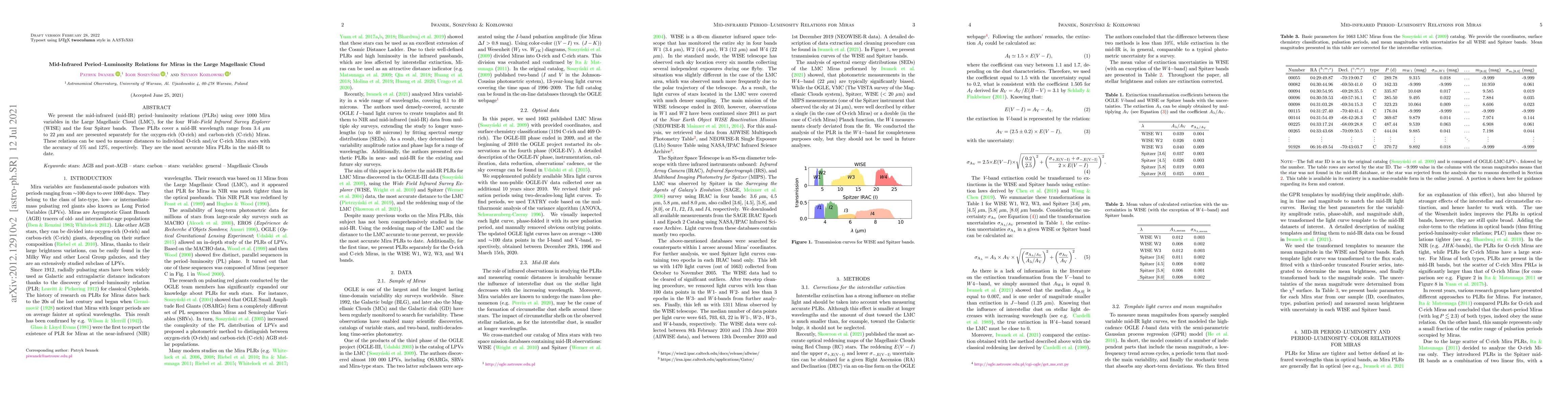 This paper establishes mid-infrared period-luminosity relations for Mira variables in the Large Magellanic Cloud using data from WISE and Spitzer, distinguishing between oxygen-rich and carbon-rich types. These relations provide accurate distance measurements for individual Mira stars, with accuracies of 5% and 12% respectively.