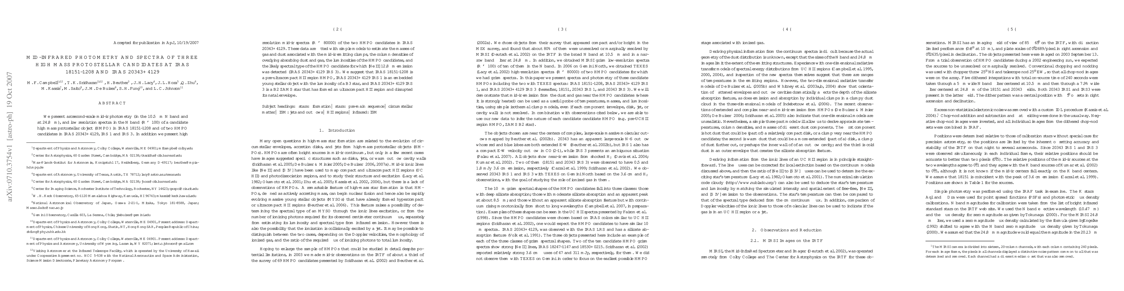 The study presents mid-infrared photometry and spectra of three high mass protostellar candidates. Using modeling, it concludes that IRAS 18151-1208 is a pre-ultracompact HII region HMPO, IRAS 20343+4129 IRS 1 is an embedded young stellar object of B3 spectral type, and IRAS 20343+4129 IRS 3 is a B2 zero-age main sequence star with an ultracompact HII region and a disrupted natal envelope.