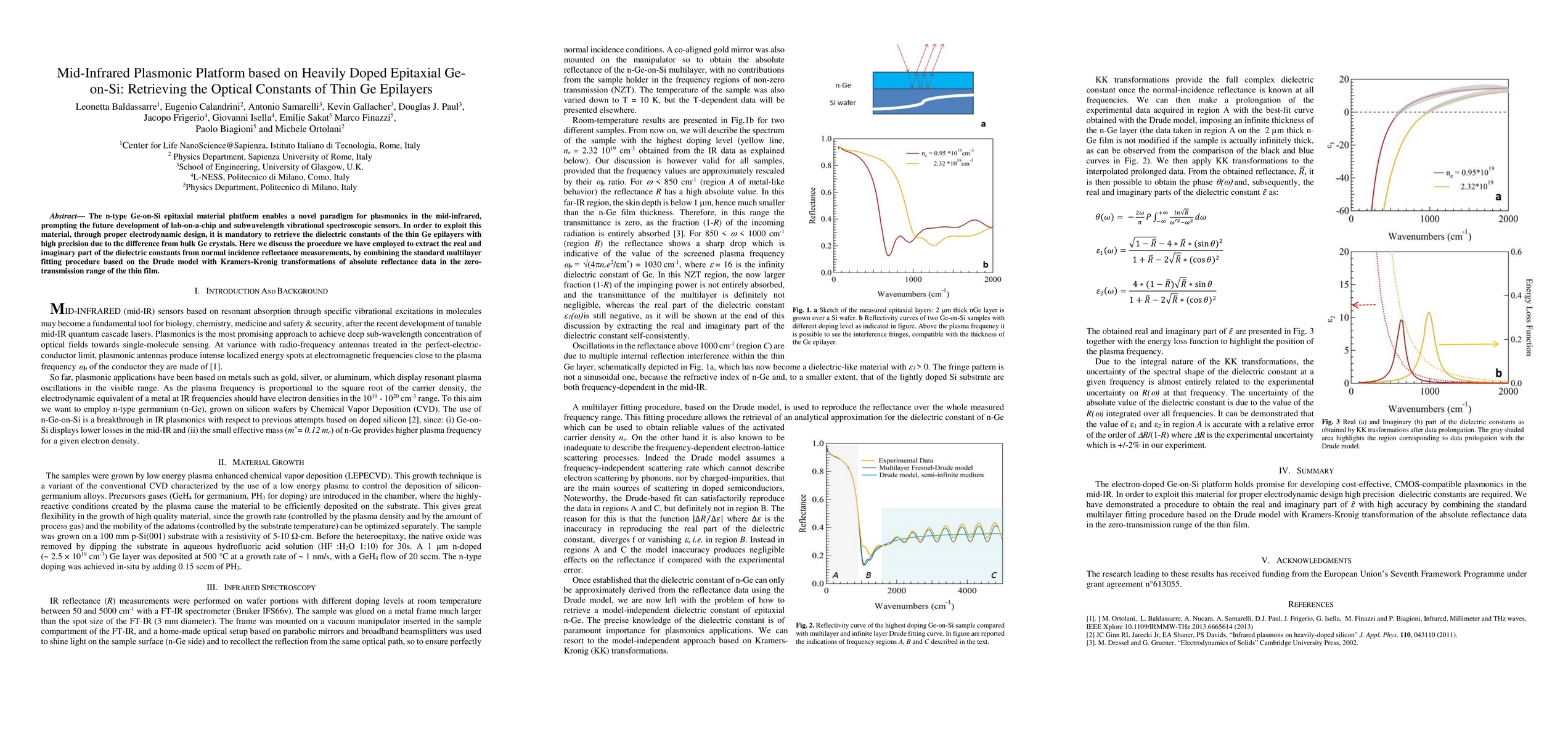 This paper presents a method for determining the optical constants of thin epitaxial Ge layers on Si for mid-infrared plasmonic applications. The authors combine Drude model fitting and Kramers-Kronig transformations to extract precise dielectric constants from reflectance measurements, enabling the development of advanced lab-on-a-chip sensors.
