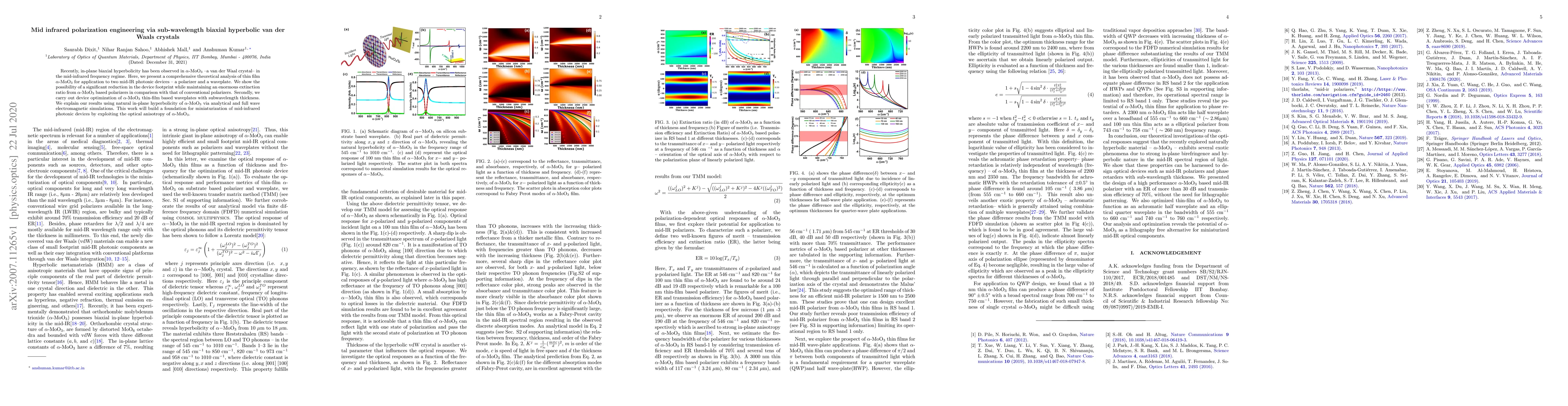 Recently, in-plane biaxial hyperbolicity has been observed in $\alpha$-MoO${_3}$ --a van der Waal crystal-- in the mid-infrared frequency regime. Here, we present a comprehensive theoretical analysis of thin film $\alpha$-MoO${_3}$ for application to two mid-IR photonic devices -- a polarizer and a waveplate. We show the possibility of a significant reduction in the device footprint while maintaining an enormous extinction ratio from $\alpha$-MoO${_3}$ based polarizers in comparison with that of conventional polarizers. Secondly, we carry out device optimization of $\alpha$-MoO${_3}$ based waveplates with subwavelength thickness. We explain our results using natural in-plane hyperbolicity of $\alpha$-MoO${_3}$ via analytical and full wave simulations. This work will build a foundation for miniaturization of mid-infrared photonic devices by exploiting the optical anisotropy of $\alpha$-MoO${_3}$.