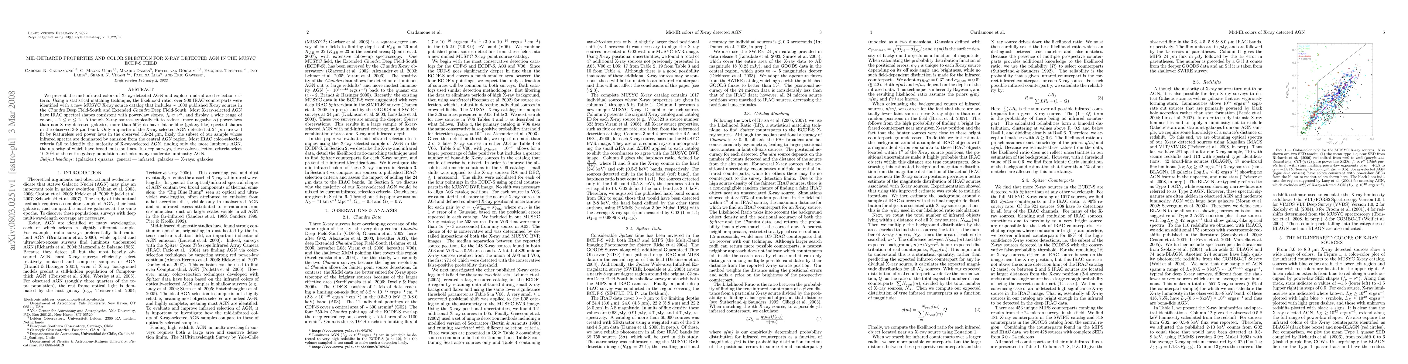This study investigates the mid-infrared properties of X-ray-detected AGNs in the MUSYC ECDF-S field, identifying over 900 IRAC counterparts using statistical matching. Most AGNs exhibit a wide range of mid-infrared colors, with only a quarter fitting featureless red power laws, suggesting diverse infrared spectral shapes.