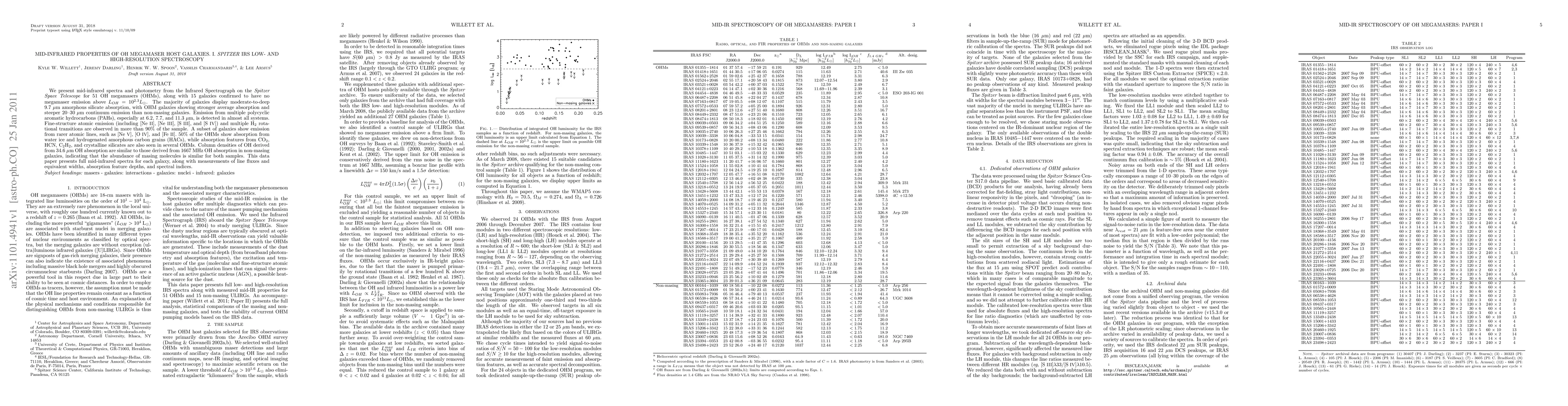 This study uses Spitzer Space Telescope's Infrared Spectrograph to analyze mid-infrared spectra of 51 OH megamasers and 15 non-masing galaxies, finding stronger silicate absorption and steeper continuum emission in megamaser host galaxies. PAH emission and fine-structure atomic lines are prevalent across both groups, with additional rare atomic lines and molecular absorption features observed in some.