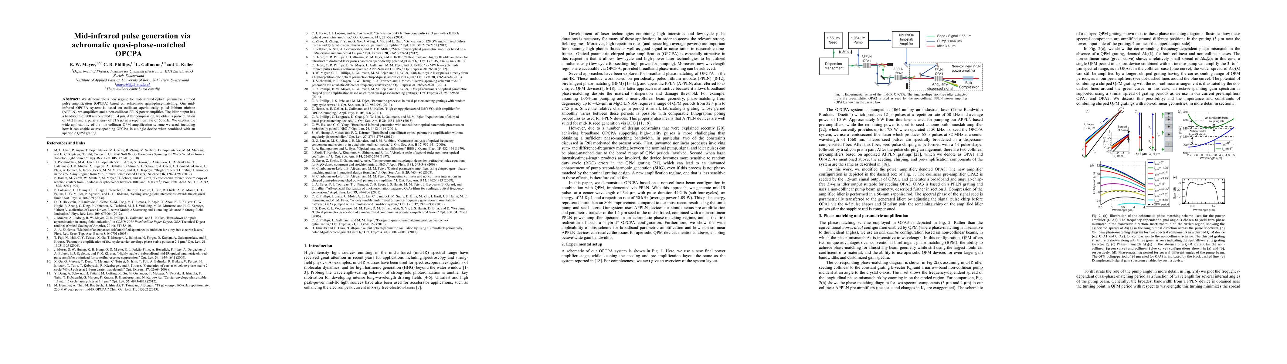 The research employs a mid-IR OPCPA system based on collinear aperiodically poled lithium niobate (APPLN) pre-amplifiers and a non-collinear PPLN power amplifier, pumped at 1064-nm by an industrial laser producing 12-ps pulses at a repetition rate of 50 kHz.