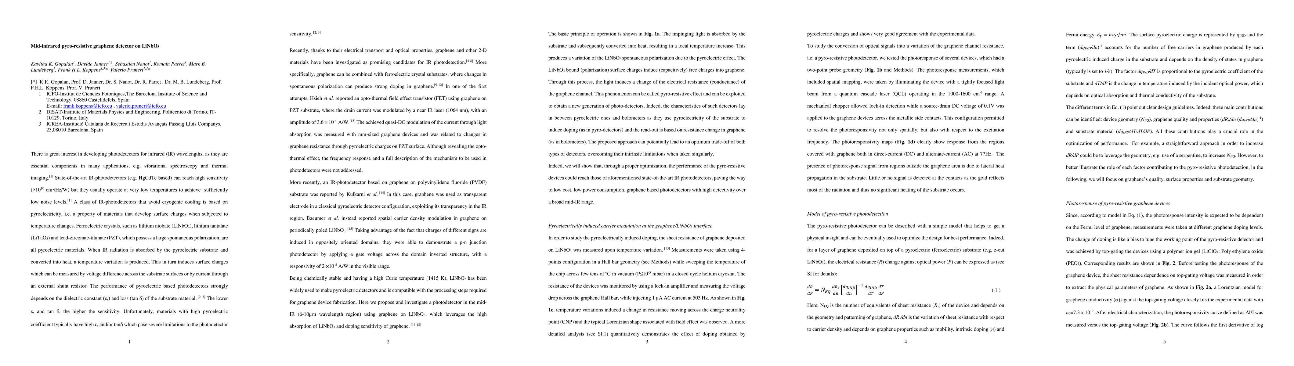 This paper proposes a novel mid-infrared pyro-resistive photo-detector combining a graphene layer on a z-cut LiNbO3 substrate, demonstrating detectivities of 10^5 cm sqrt(Hz)/W. The device operates based on the pyroelectric effect, where absorbed light induces temperature changes that alter graphene's conductivity, enabling mid-IR power measurement.