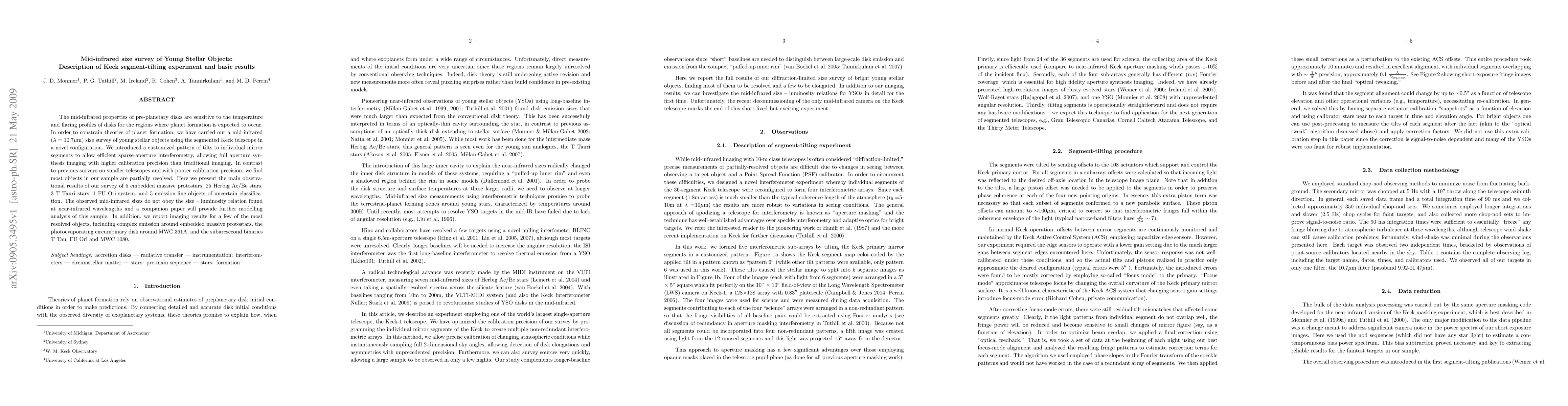 The mid-infrared properties of pre-planetary disks are sensitive to the temperature and flaring profiles of disks for the regions where planet formation is expected to occur. In order to constrain theories of planet formation, we have carried out a mid-infrared (wavelength 10.7 microns) size survey of young stellar objects using the segmented Keck telescope in a novel configuration. We introduced a customized pattern of tilts to individual mirror segments to allow efficient sparse-aperture interferometry, allowing full aperture synthesis imaging with higher calibration precision than traditional imaging. In contrast to previous surveys on smaller telescopes and with poorer calibration precision, we find most objects in our sample are partially resolved. Here we present the main observational results of our survey of 5 embedded massive protostars, 25 Herbig Ae/Be stars, 3 T Tauri stars, 1 FU Ori system, and 5 emission-line objects of uncertain classification. The observed mid-infrared sizes do not obey the size-luminosity relation found at near-infrared wavelengths and a companion paper will provide further modelling analysis of this sample. In addition, we report imaging results for a few of the most resolved objects, including complex emission around embedded massive protostars, the photoevaporating circumbinary disk around MWC 361A, and the subarcsecond binaries T Tau, FU Ori and MWC 1080.