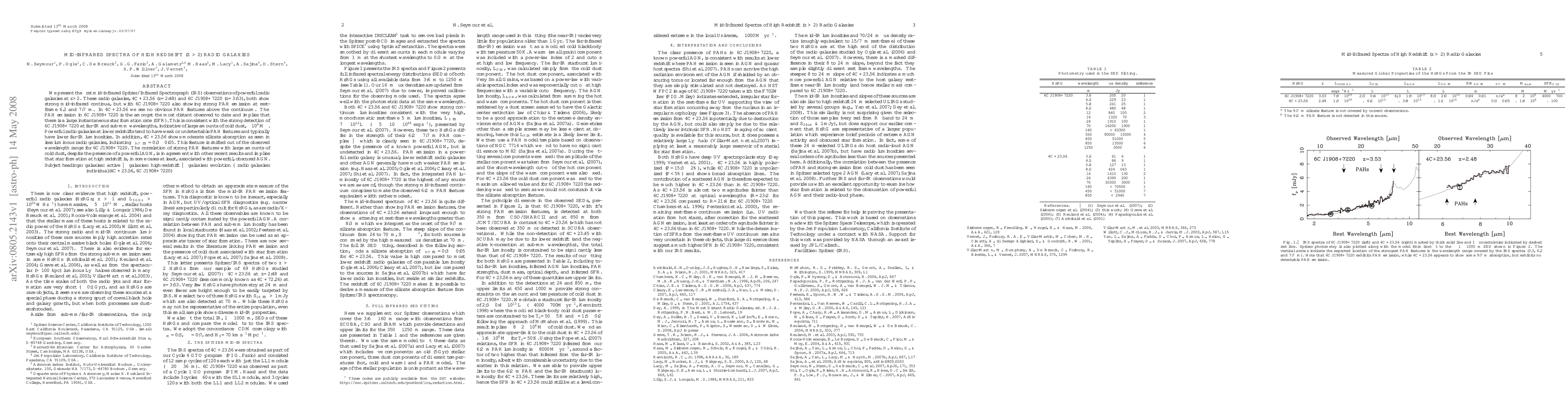 This study presents mid-infrared spectra of high redshift radio galaxies using Spitzer/IRS, revealing strong mid-infrared continua and significant PAH emissions in 6C J1908+7220, indicating high star formation rates and large amounts of cold dust. In contrast, 4C +23.56 shows no obvious PAH features and moderate silicate absorption.