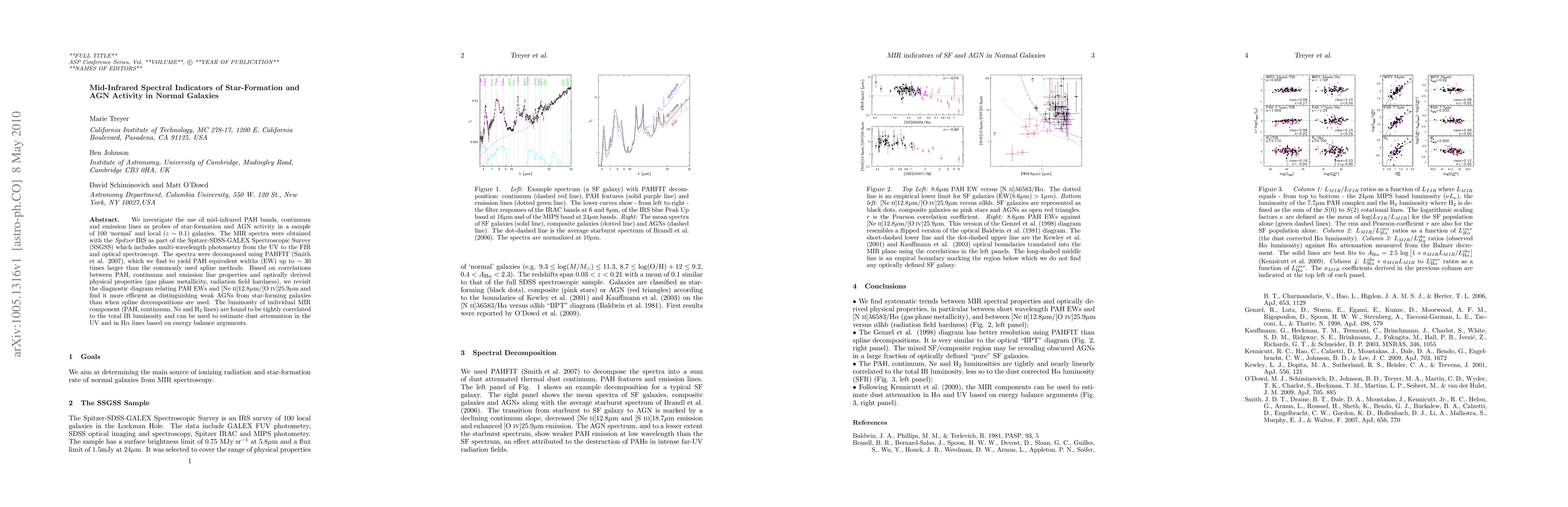 We investigate the use of mid-infrared PAH bands, continuum and emission lines as probes of star-formation and AGN activity in a sample of 100 `normal' and local (z~0.1) galaxies. The MIR spectra were obtained with the Spitzer IRS as part of the Spitzer-SDSS-GALEX Spectroscopic Survey (SSGSS) which includes multi-wavelength photometry from the UV to the FIR and optical spectroscopy. The spectra were decomposed using PAHFIT (Smith et al. 2007), which we find to yield PAH equivalent widths (EW) up to ~30 times larger than the commonly used spline methods. Based on correlations between PAH, continuum and emission line properties and optically derived physical properties (gas phase metallicity, radiation field hardness), we revisit the diagnostic diagram relating PAH EWs and [NeII]/[OIV] and find it more efficient as distinguishing weak AGNs from star-forming galaxies than when spline decompositions are used. The luminosity of individual MIR component (PAH, continuum, Ne and molecular hydrogen lines) are found to be tightly correlated to the total IR luminosity and can be used to estimate dust attenuation in the UV and in Ha lines based on energy balance arguments.