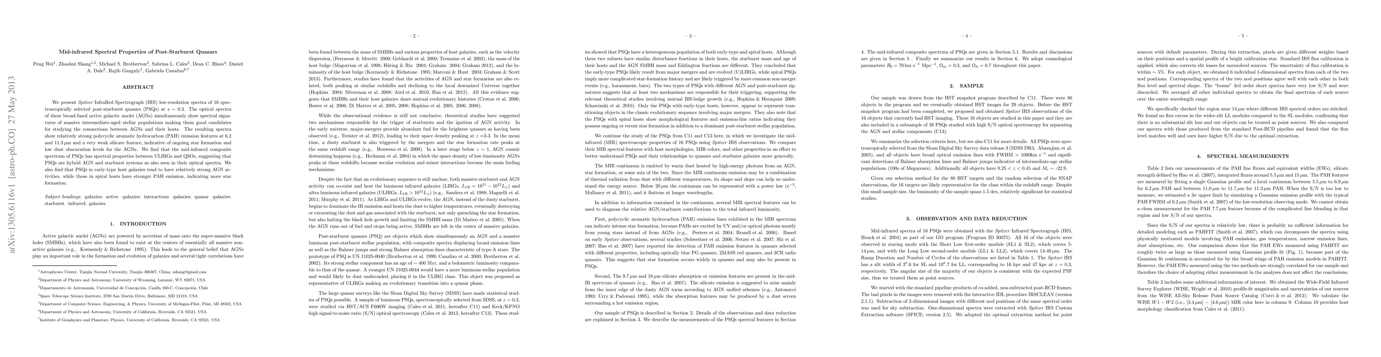 This study uses Spitzer IRS spectra to analyze 16 post-starburst quasars, revealing strong PAH emission and weak silicate features, indicating ongoing star formation and low dust obscuration. The mid-infrared composite spectrum suggests PSQs are hybrid AGN and starburst systems, with early-type hosts showing stronger AGN activity and spiral hosts exhibiting more star formation.