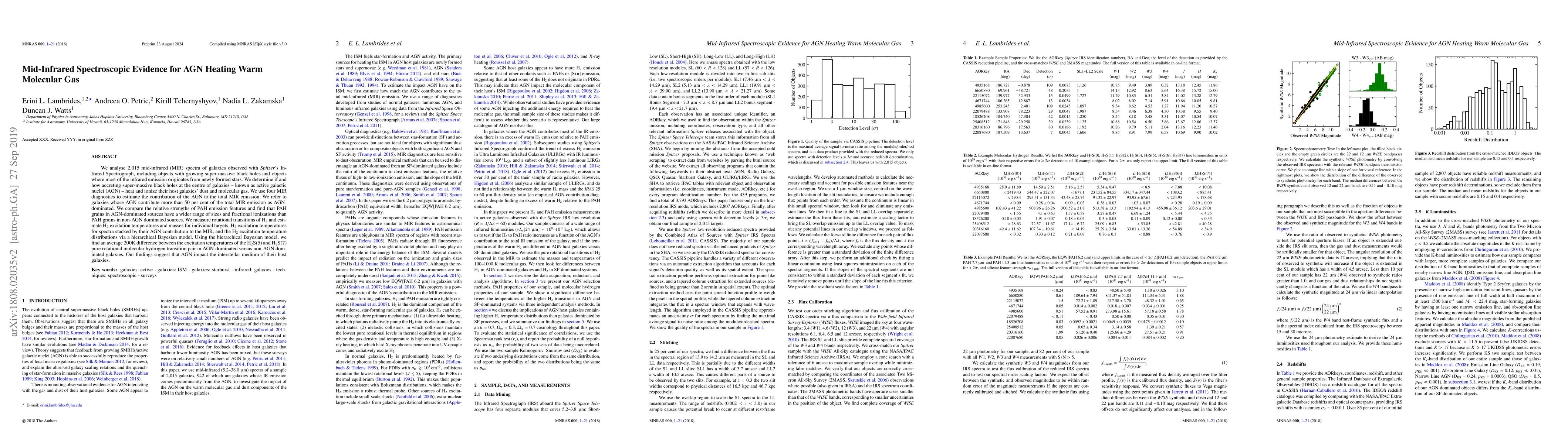 We analyse 2,015 mid-infrared (MIR) spectra of galaxies observed with Spitzer's Infrared Spectrograph, including objects with growing super-massive black holes and objects where most of the infrared emission originates from newly formed stars. We determine if and how accreting super-massive black holes at the centre of galaxies -- known as active galactic nuclei (AGN) -- heat and ionize their host galaxies' dust and molecular gas. We use four MIR diagnostics to estimate the contribution of the AGN to the total MIR emission. We refer to galaxies whose AGN contribute more than 50 per cent of the total MIR emission as AGN-dominated. We compare the relative strengths of PAH emission features and find that PAH grains in AGN-dominated sources have a wider range of sizes and fractional ionizations than PAH grains in non-AGN dominated sources. We measure rotational transitions of H_2 and estimate H_2 excitation temperatures and masses for individual targets, H_2 excitation temperatures for spectra stacked by their AGN contribution to the MIR, and the H_2 excitation temperature distributions via a hierarchical Bayesian model. We find an average 200 K difference between the excitation temperatures of the H_2 S(5) and H_2 S(7) pure rotational molecular hydrogen transition pair in AGN-dominated versus non-AGN dominated galaxies. Our findings suggest that AGN impact the interstellar medium of their host galaxies.