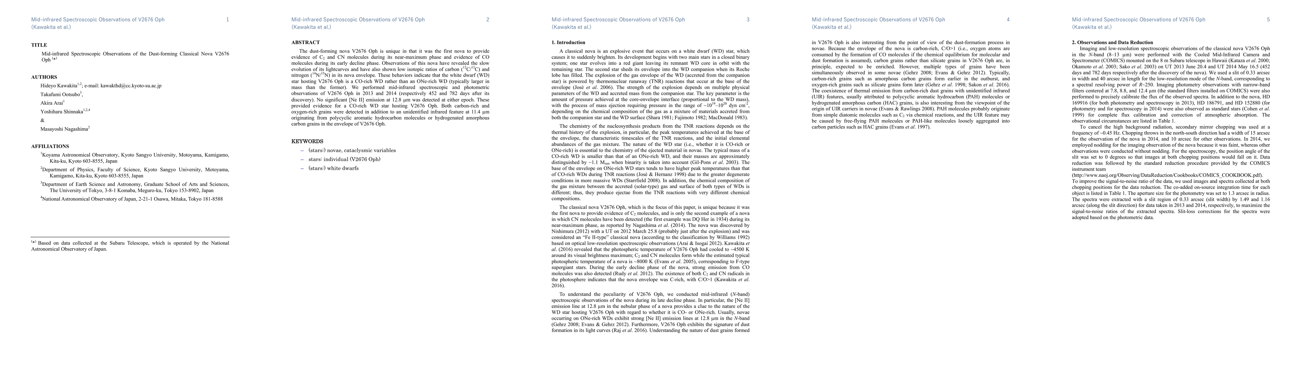 The research paper details mid-infrared spectroscopic observations of the dust-forming classical nova V2676 Oph. Key findings include the absence of [Ne II] emission, supporting a CO-rich white dwarf, and detection of carbon-rich and oxygen-rich grains alongside an unidentified feature from polycyclic aromatic hydrocarbons or hydrogenated amorphous carbon. These results suggest the white dwarf is CO-rich, not ONe-rich, and provide insights into nova envelope composition and evolution.