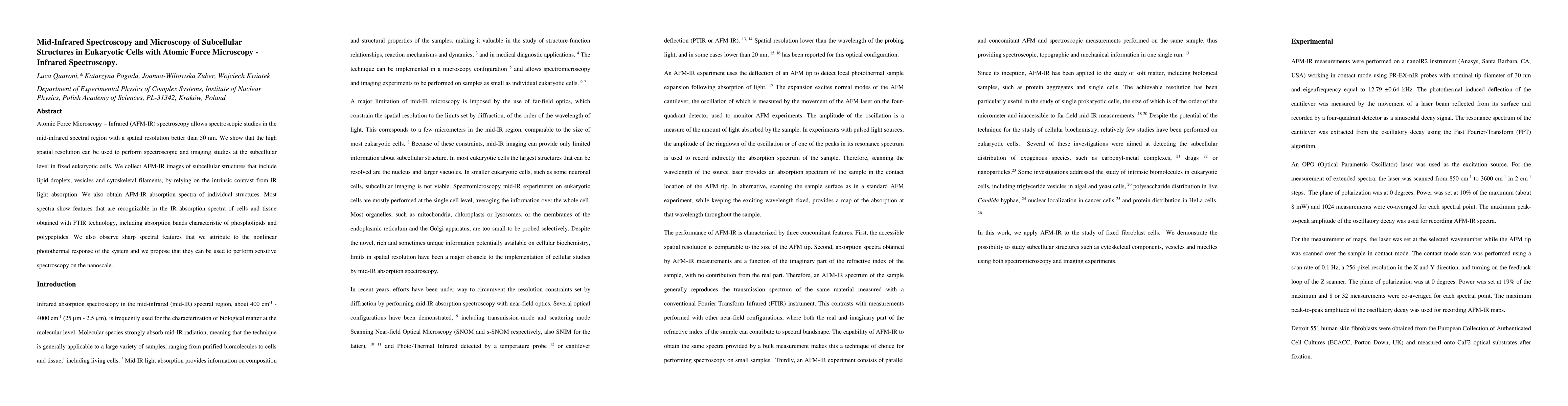 This paper demonstrates the use of AFM-IR spectroscopy for high-resolution mid-infrared imaging and spectroscopy of subcellular structures in eukaryotic cells, revealing features like lipid droplets and cytoskeletal filaments, and proposing the potential for sensitive nanoscale spectroscopy.