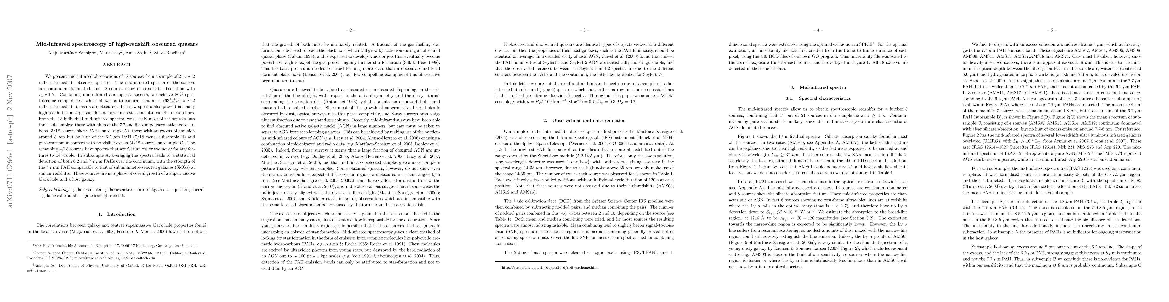 This paper reports mid-infrared observations of high-redshift quasars, revealing that most are obscured and lack ultraviolet emission lines. It categorizes the sources into three subsamples based on mid-infrared features, with some showing polyaromatic hydrocarbons indicative of coeval black hole and galaxy growth.