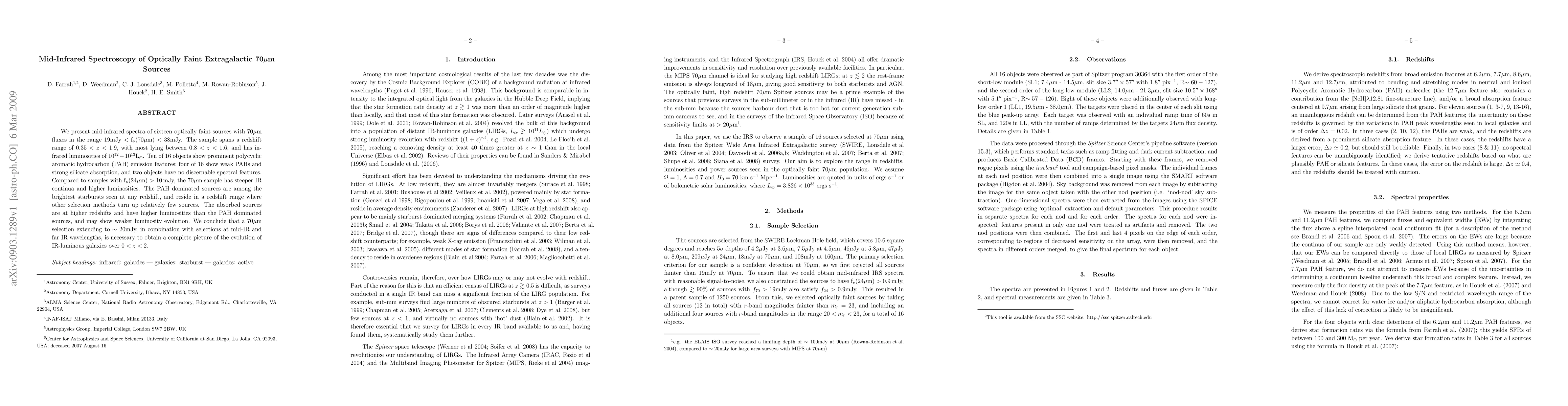 The research presents mid-infrared spectra of 16 optically faint sources with 70 micron fluxes in the range 19-38mJy, spanning redshifts 0.35<z<1.9 and infrared luminosities of 10^{12} - 10^{13} solar luminosities, using Spitzer IRS.