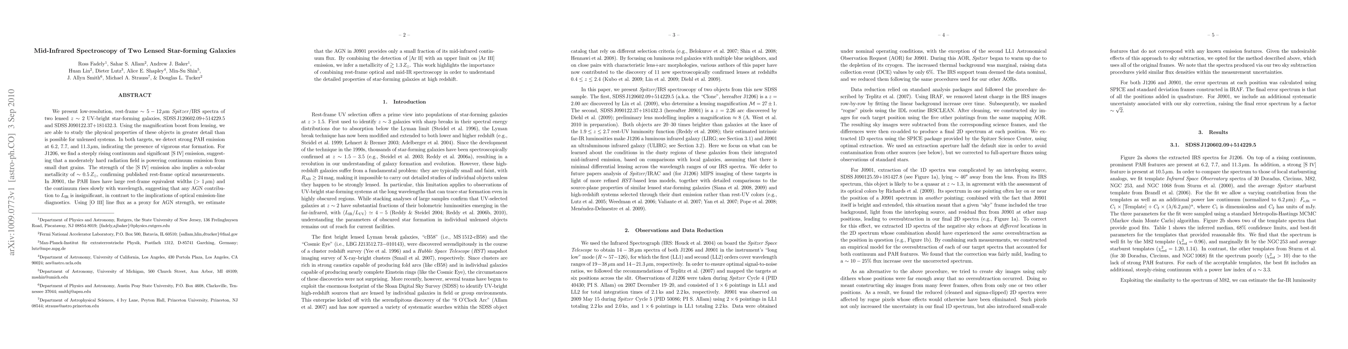 This study uses Spitzer/IRS spectroscopy to analyze two lensed, high-redshift star-forming galaxies, revealing vigorous star formation through strong PAH emissions. The analysis indicates a moderately hard radiation field and sub-solar metallicity in one galaxy, while the other shows negligible AGN contribution to its infrared luminosity, suggesting higher metallicity.