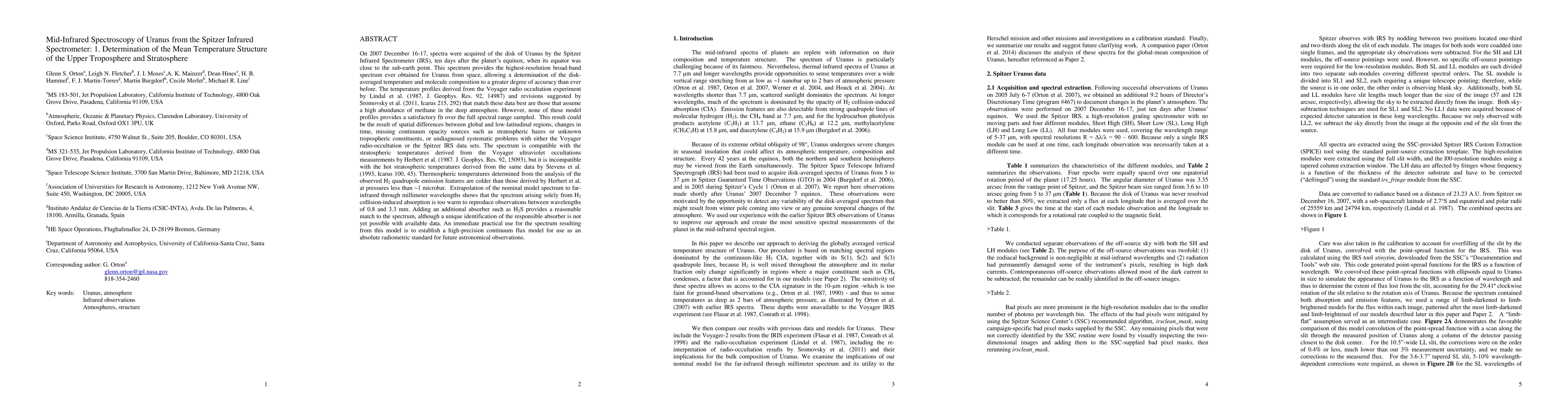 On 2007 December 16-17, spectra were acquired of the disk of Uranus by the Spitzer Infrared Spectrometer (IRS) when its equator was close to the sub-earth point. This spectrum provides the highest-resolution broad-band spectrum ever obtained for Uranus from space, allowing a determination of the disk-averaged temperature and molecule composition to a greater degree of accuracy than ever before. The temperature profiles derived from the Voyager radio occultation experiments that match these data best are those that assume a high abundance of methane in the deep atmosphere, but none of these models provides a satisfactory fit over the full spectral range. This be the result of spatial differences between global and low-latitudinal regions, changes in time, missing continuum opacity sources such as stratospheric hazes or unknown tropospheric constituents, or undiagnosed systematic problems with either the radio-occultation or the Spitzer IRS data sets. The spectrum is compatible with the stratospheric temperatures derived from the Voyager ultraviolet occultations measurements. Thermospheric temperatures determined from the analysis of the observed H2 quadrupole emission features are colder than those derived by Herbert et al. at pressures less than ~1 microbar. Extrapolation of the nominal model spectrum to far-infrared through millimeter wavelengths shows that the spectrum arising solely from H2 collision-induced absorption is too warm to reproduce observations between wavelengths of 0.8 and 3.3 mm. Adding an additional absorber such as H2S provides a reasonable match to the spectrum, although a unique identification of the responsible absorber is not yet possible with available data. An immediate practical use for the spectrum resulting from this model is to establish a high-precision continuum flux model for use as an absolute radiometric standard for future astronomical observations.