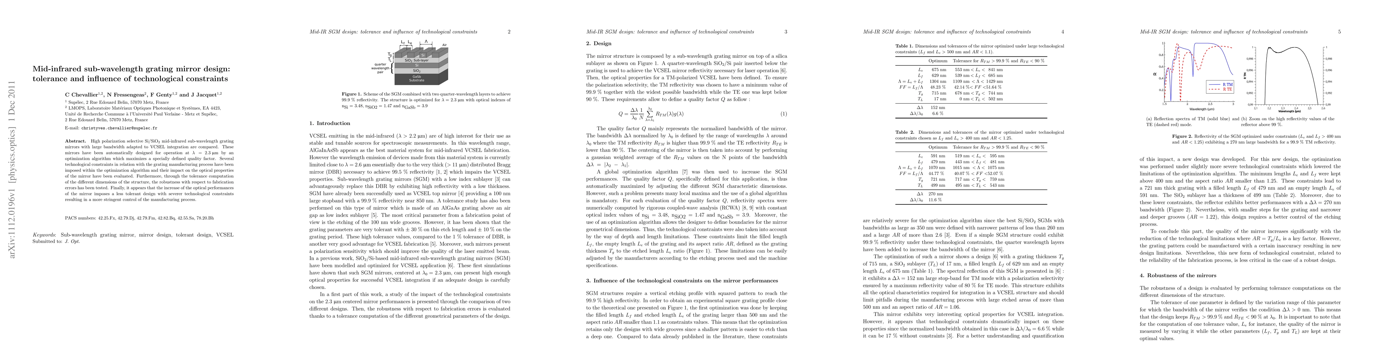 High polarization selective Si/SiO2 mid-infrared sub-wavelength grating mirrors with large bandwidth adapted to VCSEL integration are compared. These mirrors have been automatically designed for operation at \lambda = 2.3 $\mu$m by an optimization algorithm which maximizes a specially defined quality factor. Several technological constraints in relation with the grating manufacturing process have been imposed within the optimization algorithm and their impact on the optical properties of the mirror have been evaluated. Furthermore, through the tolerance computation of the different dimensions of the structure, the robustness with respect to fabrication errors has been tested. Finally, it appears that the increase of the optical performances of the mirror imposes a less tolerant design with severer technological constraints resulting in a more stringent control of the manufacturing process.