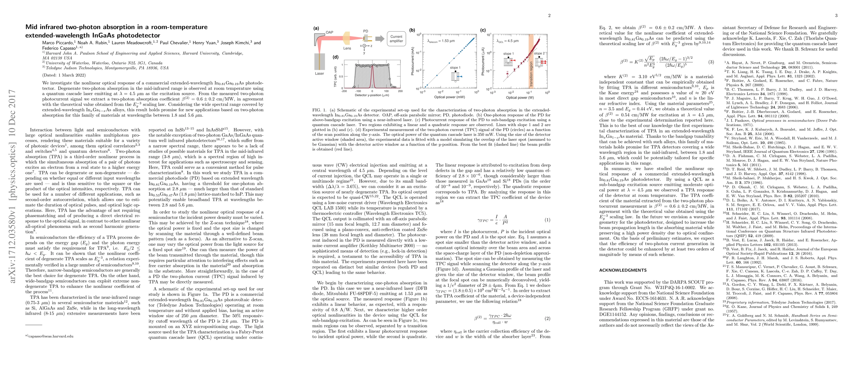 This paper investigates the mid-infrared two-photon absorption in a room-temperature extended-wavelength InGaAs photodetector, finding a two-photon absorption coefficient of $\beta^{(2)} = 0.6 \pm 0.2$ cm/MW, which aligns with theoretical predictions and suggests potential for new applications in this material range.