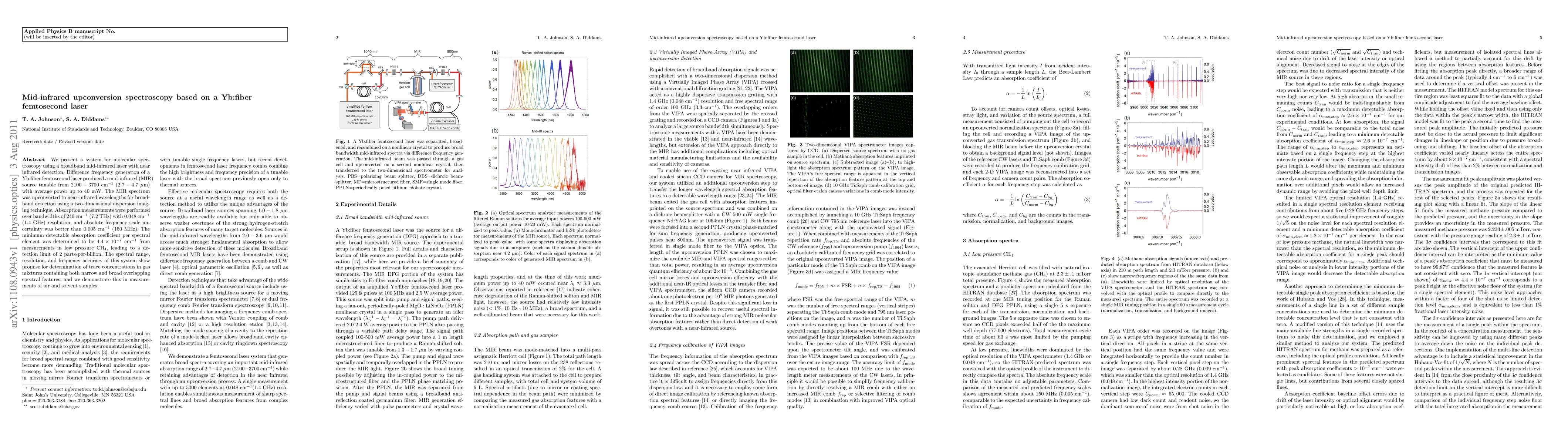 This paper introduces a mid-infrared upconversion spectroscopy system based on a Yb:fiber femtosecond laser, enabling high-resolution molecular spectroscopy with a detection limit of 2 parts-per-billion for trace gas concentrations. The system achieves a tunable mid-infrared spectrum with high frequency accuracy and resolution, suitable for analyzing complex gas mixtures.