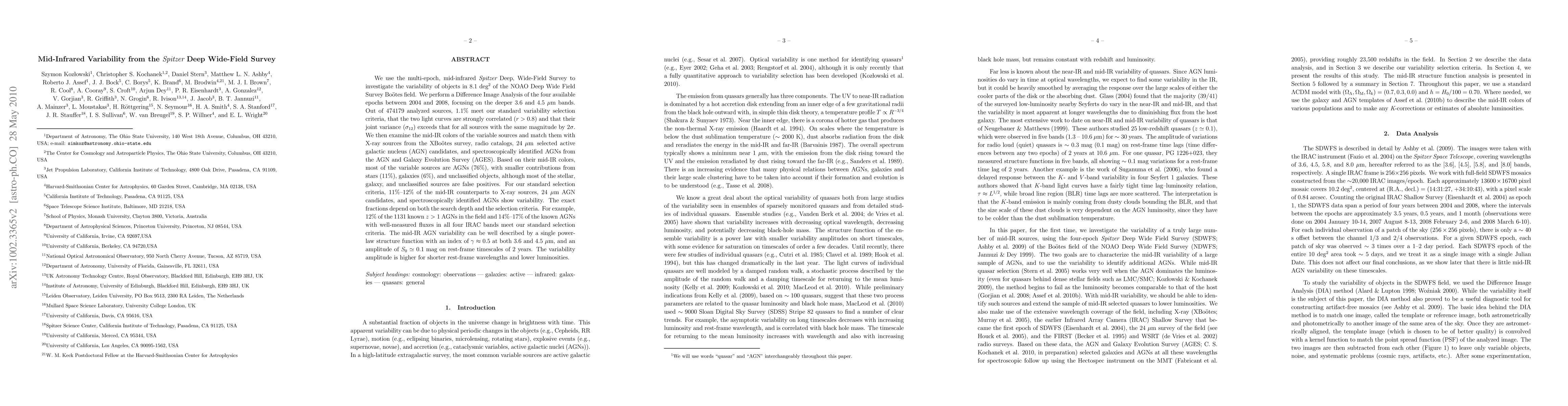 This paper investigates mid-infrared variability in the Spitzer Deep, Wide-Field Survey, finding that 1.1% of 474,179 objects show significant variability, predominantly among AGNs (76%). The study reveals a power-law structure for mid-IR AGN variability with an amplitude of 0.1 mag over 2 years.