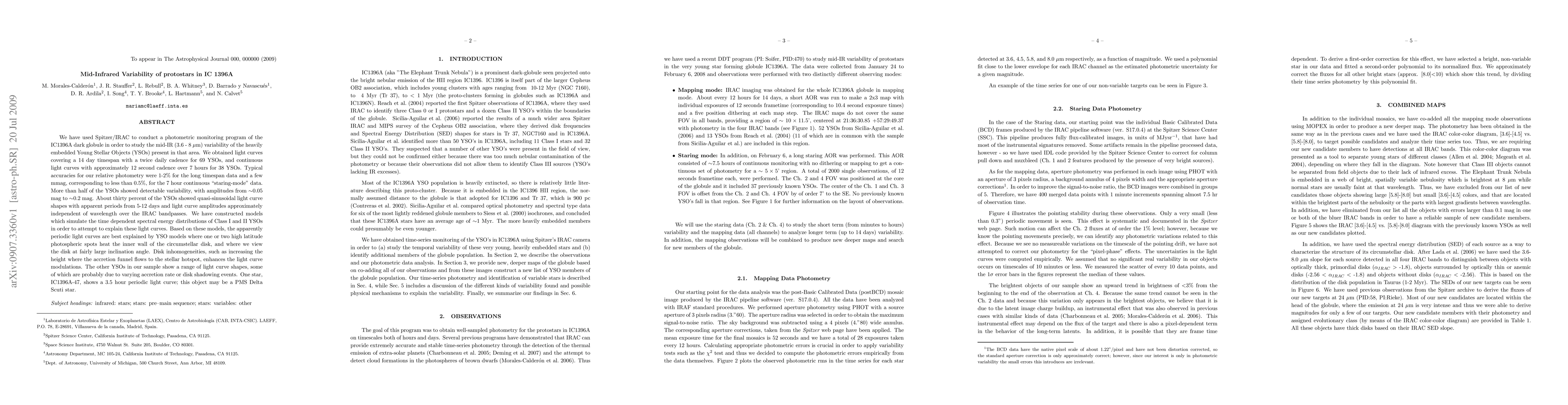 We have used Spitzer/IRAC to conduct a photometric monitoring program of the IC1396A dark globule in order to study the mid-IR (3.6 - 8 micron) variability of the heavily embedded Young Stellar Objects (YSOs) present in that area. We obtained light curves covering a 14 day timespan with a twice daily cadence for 69 YSOs, and continuous light curves with approximately 12 second cadence over 7 hours for 38 YSOs. Typical accuracies for our relative photometry were 1-2% for the long timespan data and a few mmag, corresponding to less than 0.5%, for the 7 hour continuous "staring-mode" data. More than half of the YSOs showed detectable variability, with amplitudes from ~0.05 mag to ~0.2 mag. About thirty percent of the YSOs showed quasi-sinusoidal light curve shapes with apparent periods from 5-12 days and light curve amplitudes approximately independent of wavelength over the IRAC bandpasses. We have constructed models which simulate the time dependent spectral energy distributions of Class I and I I YSOs in order to attempt to explain these light curves. Based on these models, the apparently periodic light curves are best explained by YSO models where one or two high latitude photospheric spots heat the inner wall of the circumstellar disk, and where we view the disk at fairly large inclination angle. Disk inhomogeneities, such as increasing the height where the accretion funnel flows to the stellar hotspot, enhances the light curve modulations. The other YSOs in our sample show a range of light curve shapes, some of which are probably due to varying accretion rate or disk shadowing events. One star, IC1396A-47, shows a 3.5 hour periodic light curve; this object may be a PMS Delta Scuti star.