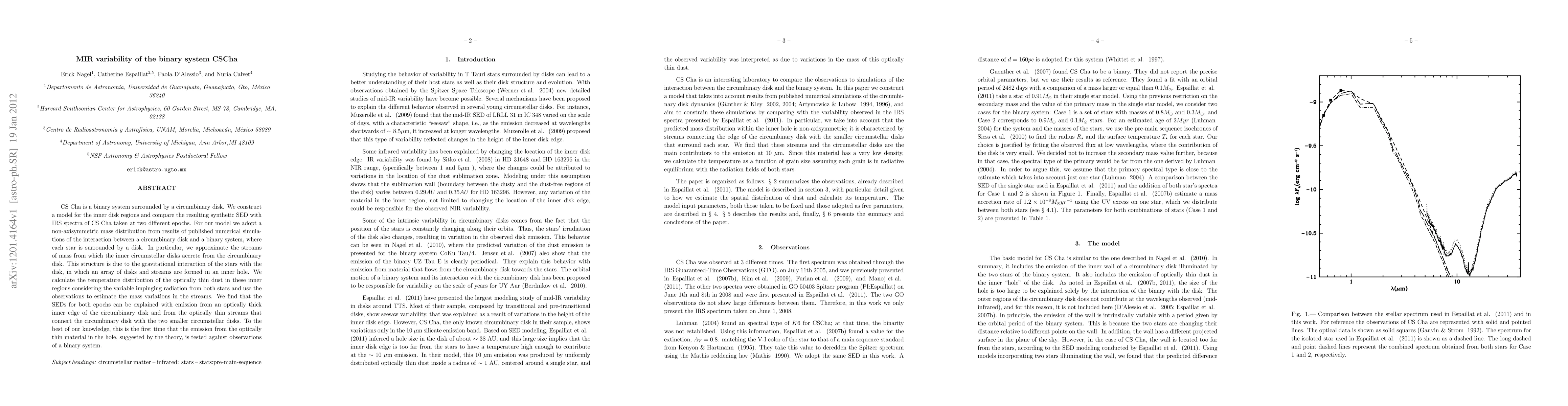 CS Cha is a binary system surrounded by a circumbinary disk. We construct a model for the inner disk regions and compare the resulting synthetic SED with IRS spectra of CS Cha taken at two different epochs. For our model we adopt a non-axisymmetric mass distribution from results of published numerical simulations of the interaction between a circumbinary disk and a binary system, where each star is surrounded by a disk. In particular, we approximate the streams of mass from which the inner circumstellar disks accrete from the circumbinary disk. This structure is due to the gravitational interaction of the stars with the disk, in which an array of disks and streams are formed in an inner hole. We calculate the temperature distribution of the optically thin dust in these inner regions considering the variable impinging radiation from both stars and use the observations to estimate the mass variations in the streams. We find that the SEDs for both epochs can be explained with emission from an optically thick inner edge of the circumbinary disk and from the optically thin streams that connect the circumbinary disk with the two smaller circumstellar disks. To the best of our knowledge, this is the first time that the emission from the optically thin material in the hole, suggested by the theory, is tested against observations of a binary system.