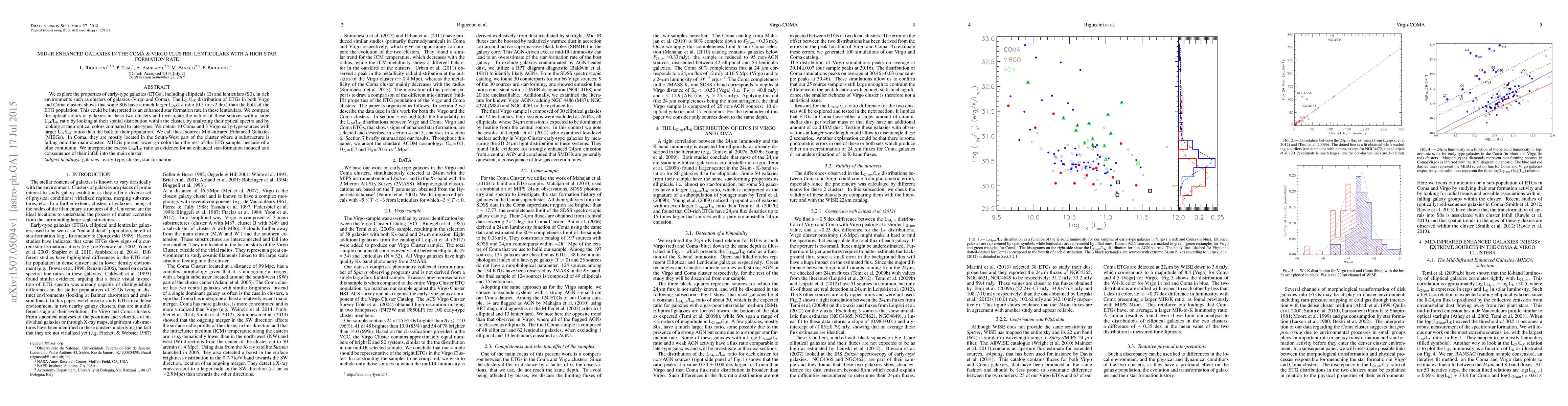 We explore the properties of early-type galaxies (ETGs), including ellipticals (E) and lenticulars (S0), in rich environments such as clusters of galaxies (Virgo and Coma). The L_24/L_K distribution of ETGs in both Virgo and Coma clusters shows that some S0s have a much larger L_24/L_K ratio (0.5 to ~2 dex) than the bulk of the ETG population. This could be interpreted as an enhanced star formation rate in these lenticulars. We compare the optical colors of galaxies in these two clusters and investigate the nature of these sources with a large L24/L_K ratio by looking at their spatial distribution within the cluster, by analyzing their optical spectra and by looking at their optical colors compared to late-types. We obtain 10 Coma and 3 Virgo early-type sources with larger L24/L_K ratios than the bulk of their population. We call these sources Mid-Infrared Enhanced Galaxies (MIEGs). In Coma, they are mostly located in the South-West part of the cluster where a substructure is falling onto the main cluster. MIEGs present lower g-r color than the rest of the ETG sample, because of a blue continuum. We interpret the excess L24/L_K ratio as evidence for an enhanced star-formation induced as a consequence of their infall into the main cluster.