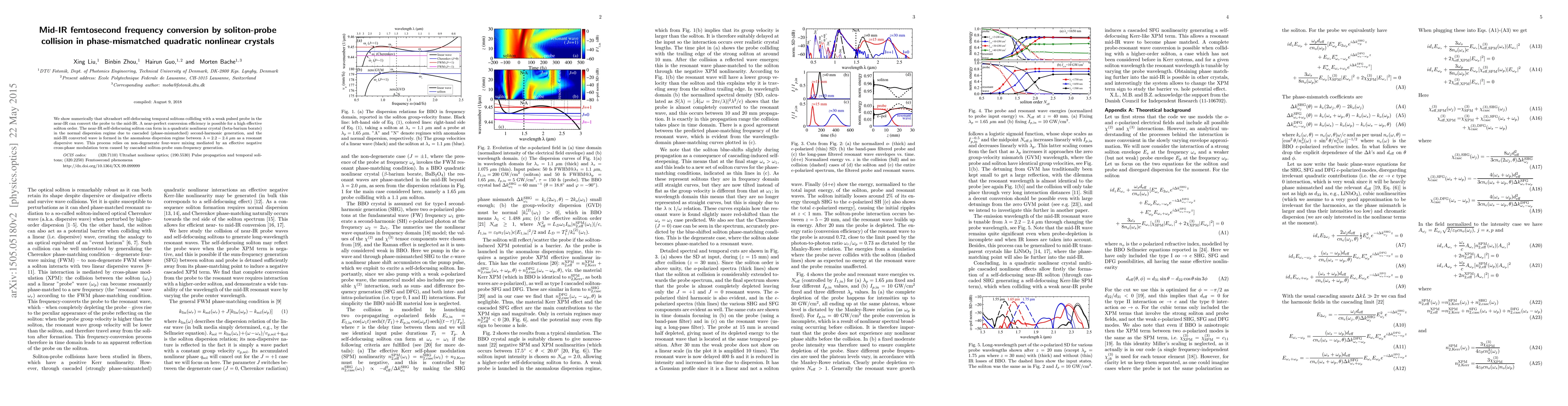 This research demonstrates numerically that colliding ultrashort self-defocusing solitons with a near-IR probe in phase-mismatched quadratic nonlinear crystals can efficiently convert the probe to mid-IR wavelengths. The method achieves near-perfect conversion efficiency through non-degenerate four-wave mixing, leveraging cascaded second-harmonic generation and effective negative cross-phase modulation.