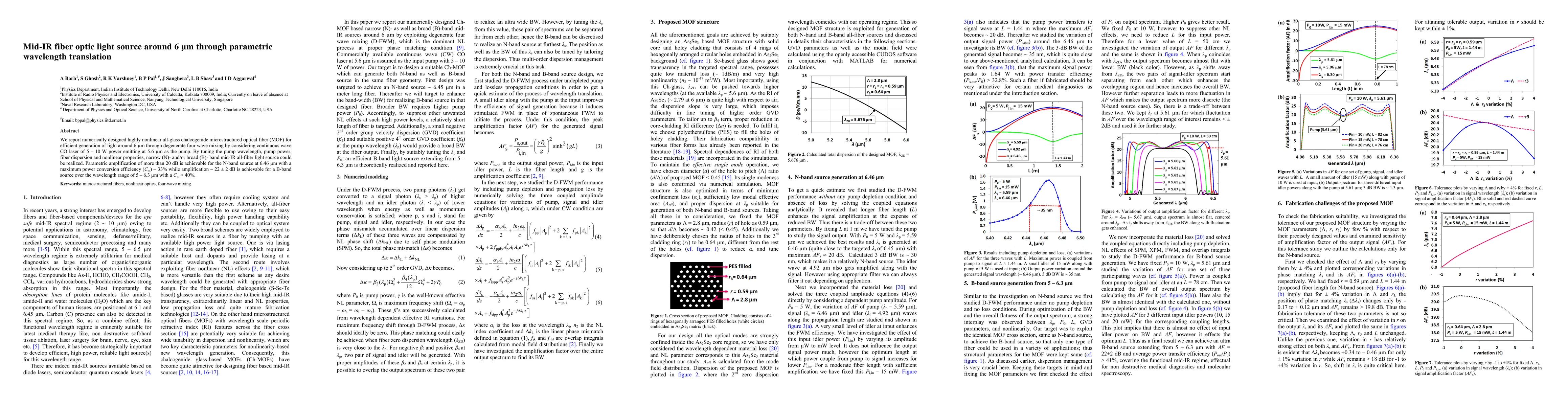 We report numerically designed highly nonlinear all glass chalcogenide microstructured optical fiber for efficient generation of light around 6 micron through degenerate four wave mixing by considering continuous wave CO laser of 5 to 10 Watts power emitting at 5.6 micron as the pump. By tuning the pump wavelength, pump power, fiber dispersion and nonlinear properties, narrow and broad band mid-IR all-fiber light source could be realized. Parametric amplification of more than 20 decibel is achievable for the narrow band source at 6.46 micron with a maximum power conversion efficiency of 33 percent while amplification of 22 decibel is achievable for a B-band source over the wavelength range of 5 to 6.3 micron with a conversion efficiency of 40 percent.