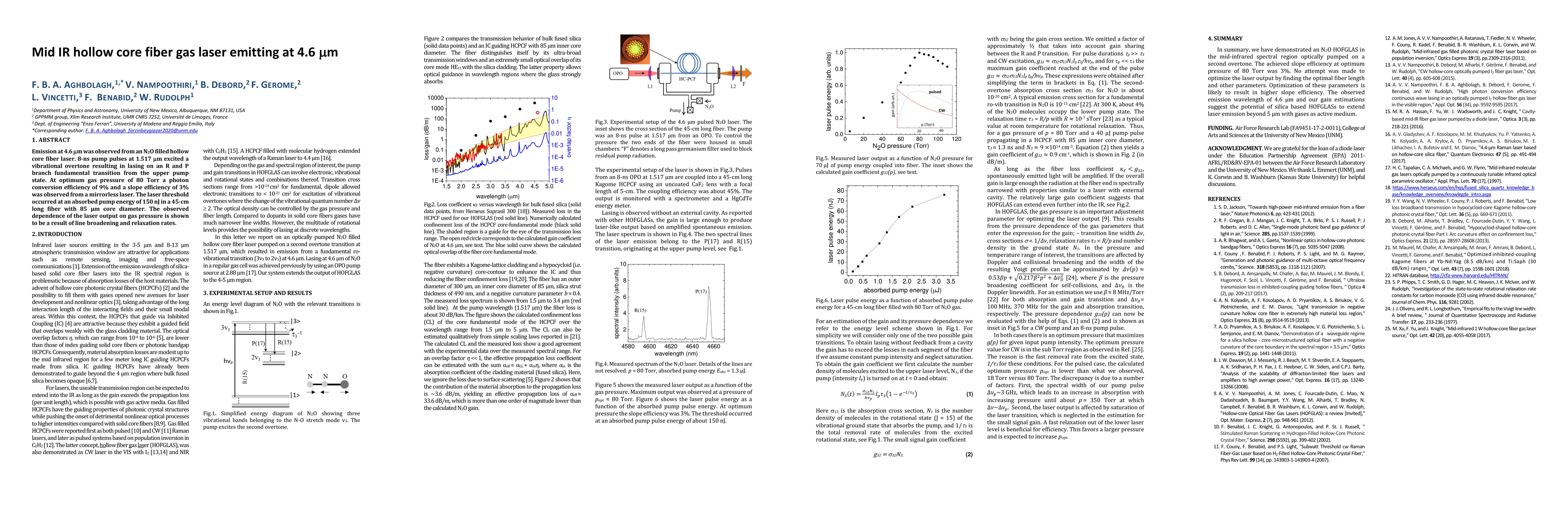 This research reports on a N2O-filled hollow core fiber laser emitting at 4.6 µm, achieving a photon conversion efficiency of 9% and a slope efficiency of 3% under optimal conditions. The laser utilizes 8-ns pump pulses at 1.517 µm, demonstrating lasing on fundamental R and P branch transitions.