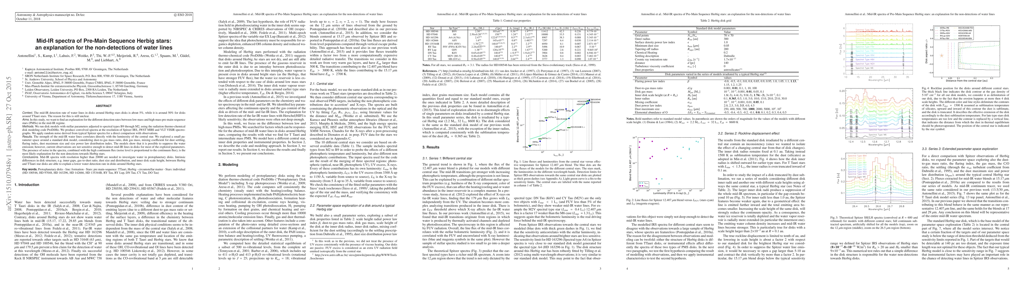 The mid-IR detection rate of water lines in disks around Herbig stars disks is about 5\%, while it is around 50\% for disks around TTauri stars. The reason for this is still unclear. In this study, we want to find an explanation for the different detection rates between low mass and high mass pre-main-sequence stars (PMSs) in the mid-IR regime. We run disk models with stellar parameters adjusted to spectral types B9 through M2, using the radiation thermo-chemical disk modeling code ProDiMo. We produce convolved spectra at the resolution of Spitzer IRS, JWST MIRI and VLT VISIR spectrographs. We apply random noise derived from typical Spitzer spectra for a direct comparison with observations. The strength of the mid-IR water lines correlates directly with the luminosity of the central star. We explored a small parameter space around a standard disk model, considering dust-to-gas mass ratio, disk gas mass, mixing coefficient for dust settling, flaring index, dust maximum size and size power law distribution index. The models show that it is possible to suppress the water emission, however, current observations are not sensitive enough to detect mid-IR lines in disks for most of the explored parameters. The presence of noise in the spectra, combined with the high continuum flux (noise level is proportional to the continuum flux), is the most likely explanation for the non detections towards Herbig stars. Mid-IR spectra with resolution higher than 20000 are needed to investigate water in protoplanetary disks. Intrinsic differences in disk structure, e.g. inner gaps, gas-to-dust ratio, dust size and distribution, and inner disk scale height, between Herbig and TTauri star disks are able to explain a lower water detection rate in disks around Herbig stars.