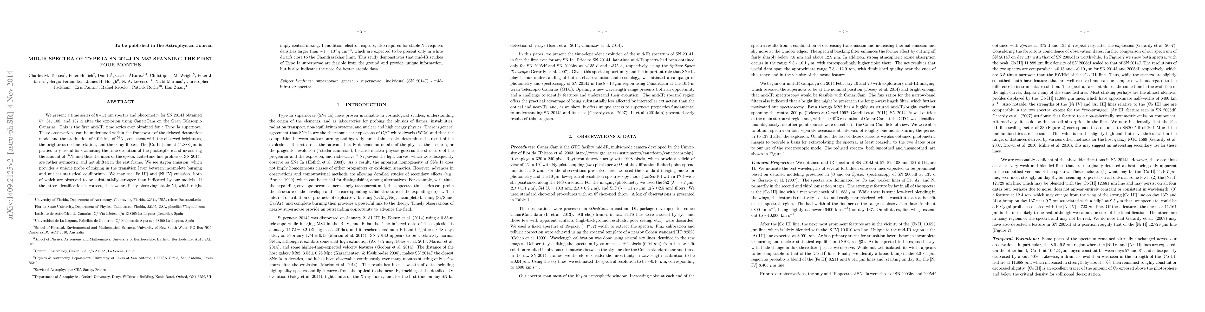 This study presents the first mid-IR time series of a Type Ia SN, 2014J, revealing insights into its ejecta mass, nickel production, and potential central mixing. Mid-IR spectra indicate ~0.6 M$_odot$ of $^{56}$Ni, supporting the delayed detonation model. Unique Argon emission suggests mixing in the burning transition layer, while possible [Fe III] and [Ni IV] emission may indicate stable Nickel, implying central mixing and densities near the Chandrasekhar limit.
