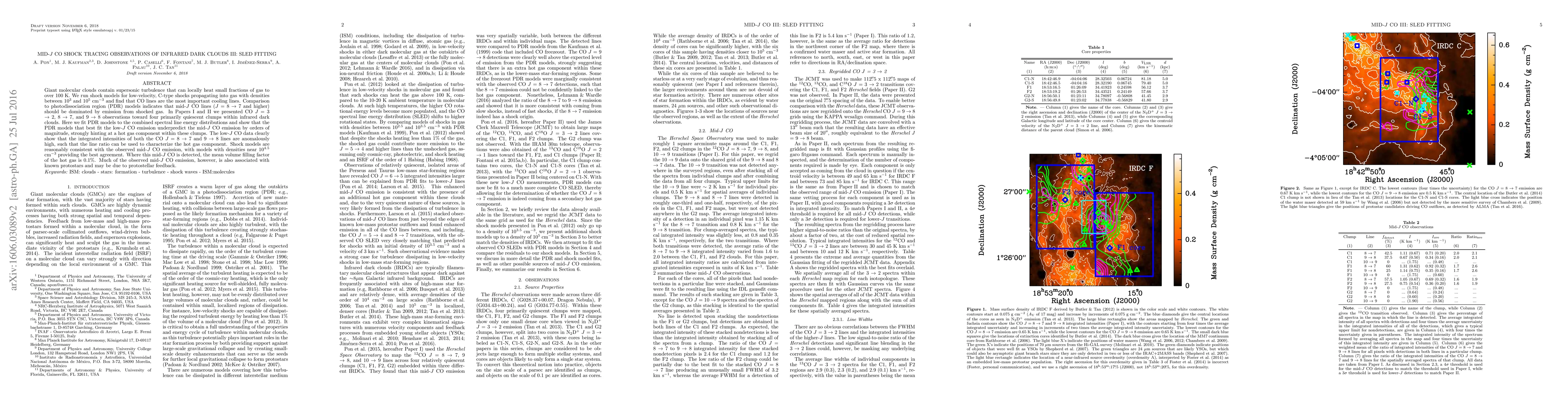 Giant molecular clouds contain supersonic turbulence that can locally heat small fractions of gas to over 100 K. We run shock models for low-velocity, C-type shocks propagating into gas with densities between 10^3 and 10^5 cm^(-3) and find that CO lines are the most important cooling lines. Comparison to photodissociation region (PDR) models indicates that mid-J CO lines (J = 8-7 and higher) should be dominated by emission from shocked gas. In Papers I and II we presented CO J = 3-2, 8-7, and 9-8 observations toward four primarily quiescent clumps within infrared dark clouds. Here we fit PDR models to the combined spectral line energy distributions and show that the PDR models that best fit the low-J CO emission underpredict the mid-J CO emission by orders of magnitude, strongly hinting at a hot gas component within these clumps. The low-J CO data clearly show that the integrated intensities of both the CO J = 8-7 and 9-8 lines are anomalously high, such that the line ratio can be used to characterize the hot gas component. Shock models are reasonably consistent with the observed mid-J CO emission, with models with densities near 10^(4.5) cm^(-3) providing the best agreement. Where this mid-J CO is detected, the mean volume filling factor of the hot gas is 0.1%. Much of the observed mid-J CO emission, however, is also associated with known protostars and may be due to protostellar feedback.