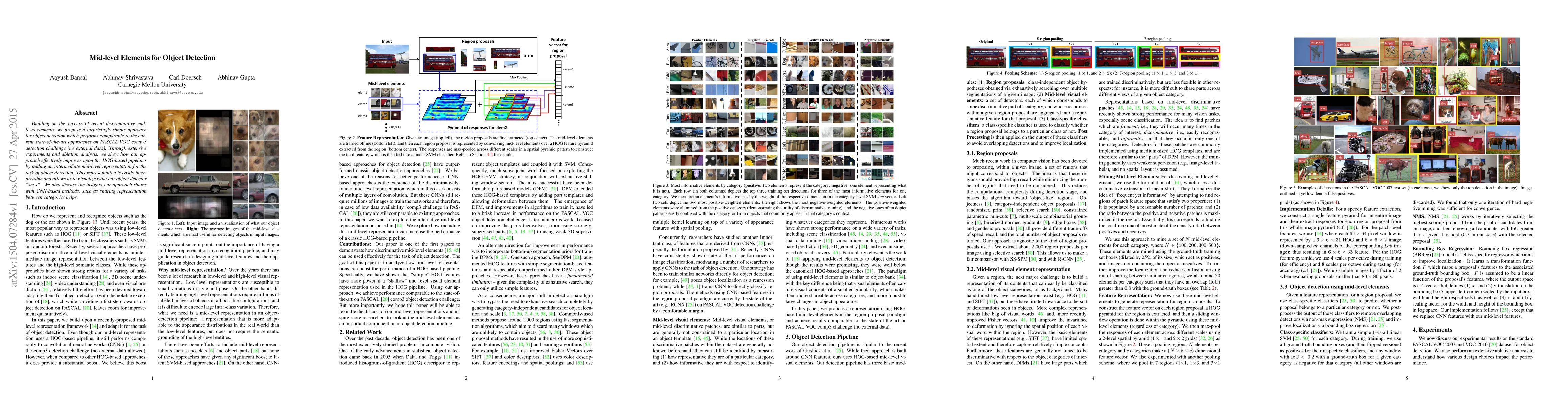 This research paper proposes a straightforward method for object detection that leverages mid-level elements, achieving performance comparable to state-of-the-art techniques on the PASCAL VOC challenge without external data. The approach enhances HOG-based pipelines by introducing an interpretable intermediate representation, offering insights similar to CNN-based methods regarding shared representations across categories.