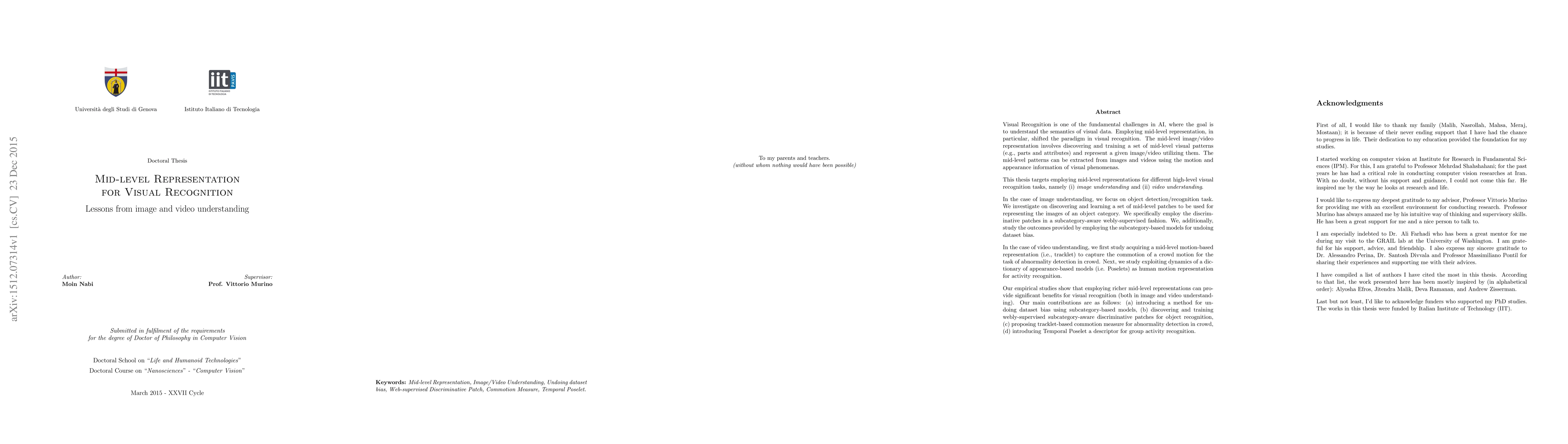 This paper explores the use of mid-level visual representations for enhancing visual recognition tasks, specifically focusing on object detection and recognition within image understanding. It investigates the discovery of discriminative mid-level patches in a subcategory-aware, webly-supervised manner to address dataset bias.
