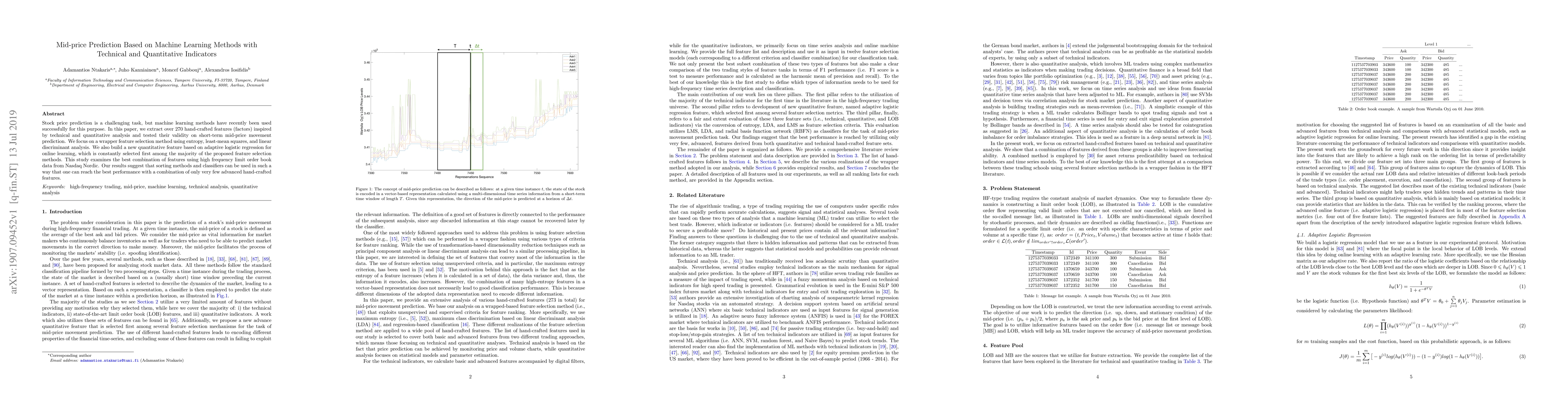 Stock price prediction is a challenging task, but machine learning methods have recently been used successfully for this purpose. In this paper, we extract over 270 hand-crafted features (factors) inspired by technical and quantitative analysis and tested their validity on short-term mid-price movement prediction. We focus on a wrapper feature selection method using entropy, least-mean squares, and linear discriminant analysis. We also build a new quantitative feature based on adaptive logistic regression for online learning, which is constantly selected first among the majority of the proposed feature selection methods. This study examines the best combination of features using high frequency limit order book data from Nasdaq Nordic. Our results suggest that sorting methods and classifiers can be used in such a way that one can reach the best performance with a combination of only very few advanced hand-crafted features.