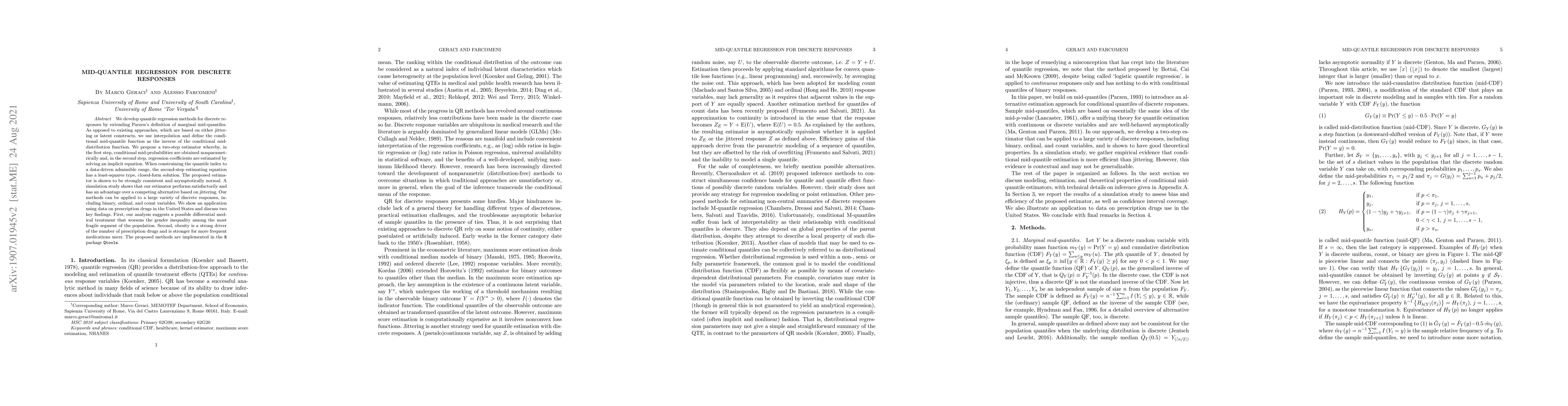 We develop quantile regression methods for discrete responses by extending Parzen's definition of marginal mid-quantiles. As opposed to existing approaches, which are based on either jittering or latent constructs, we use interpolation and define the conditional mid-quantile function as the inverse of the conditional mid-distribution function. We propose a two-step estimator whereby, in the first step, conditional mid-probabilities are obtained nonparametrically and, in the second step, regression coefficients are estimated by solving an implicit equation. When constraining the quantile index to a data-driven admissible range, the second-step estimating equation has a least-squares type, closed-form solution. The proposed estimator is shown to be strongly consistent and asymptotically normal. A simulation study shows that our estimator performs satisfactorily and has an advantage over a competing alternative based on jittering. Our methods can be applied to a large variety of discrete responses, including binary, ordinal, and count variables. We show an application using data on prescription drugs in the United States and discuss two key findings. First, our analysis suggests a possible differential medical treatment that worsens the gender inequality among the most fragile segment of the population. Second, obesity is a strong driver of the number of prescription drugs and is stronger for more frequent medications users. The proposed methods are implemented in the R package Qtools.