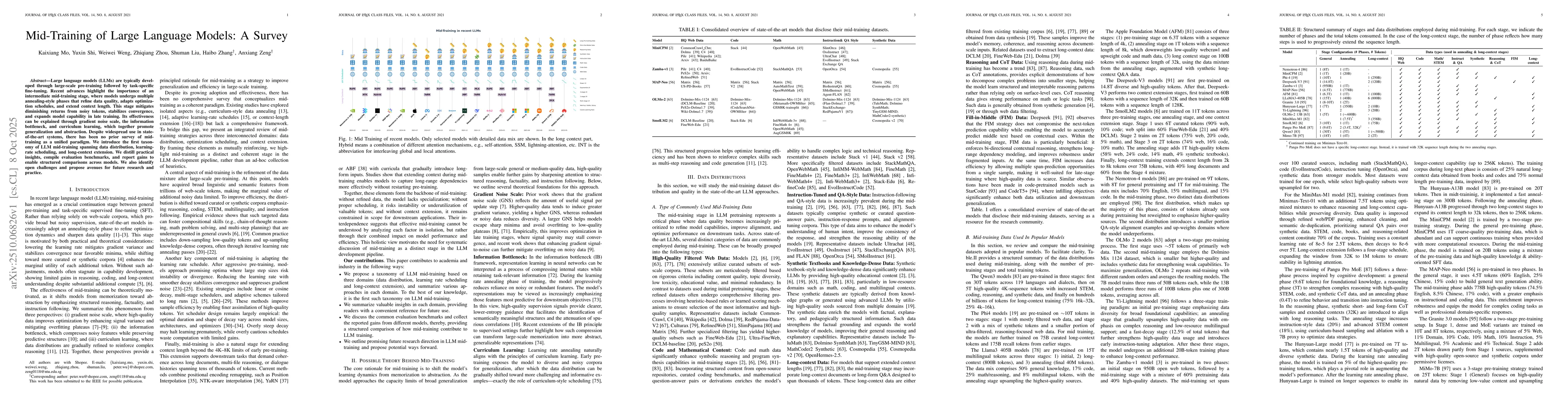 Large language models (LLMs) are typically developed through large-scale pre-training followed by task-specific fine-tuning. Recent advances highlight the importance of an intermediate mid-training stage, where models undergo multiple annealing-style phases that refine data quality, adapt optimization schedules, and extend context length. This stage mitigates diminishing returns from noisy tokens, stabilizes convergence, and expands model capability in late training. Its effectiveness can be explained through gradient noise scale, the information bottleneck, and curriculum learning, which together promote generalization and abstraction. Despite widespread use in state-of-the-art systems, there has been no prior survey of mid-training as a unified paradigm. We introduce the first taxonomy of LLM mid-training spanning data distribution, learning-rate scheduling, and long-context extension. We distill practical insights, compile evaluation benchmarks, and report gains to enable structured comparisons across models. We also identify open challenges and propose avenues for future research and practice.