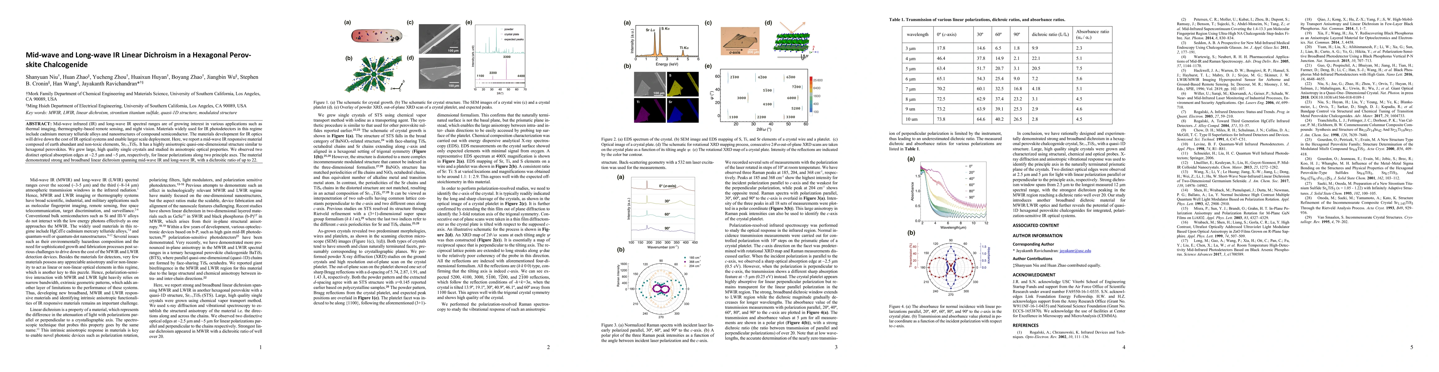 Mid-wave infrared (IR) and long-wave IR spectral ranges are of growing interest in various applications such as thermal imaging, thermography-based remote sensing, and night vision. Materials widely used for IR photodetectors in this regime include cadmium mercury telluride alloys and nanostructures of compound semiconductor. The materials development for IR optics will drive down the cost of IR optical systems and enable larger scale deployment. Here, we report a mid-wave IR responsive material composed of earth abundant and non-toxic elements, Sr1+xTiS3. It has a highly anisotropic quasi-one-dimensional structure similar to hexagonal perovskites. We grew large, high quality single crystals and studied its anisotropic optical properties. We observed two distinct optical absorption edges at ~2.5 um and ~5 um, respectively, for linear polarizations along two principal axes. The material demonstrated strong and broadband linear dichroism spanning mid-wave IR and long-wave IR, with a dichroitic ratio of up to 22.