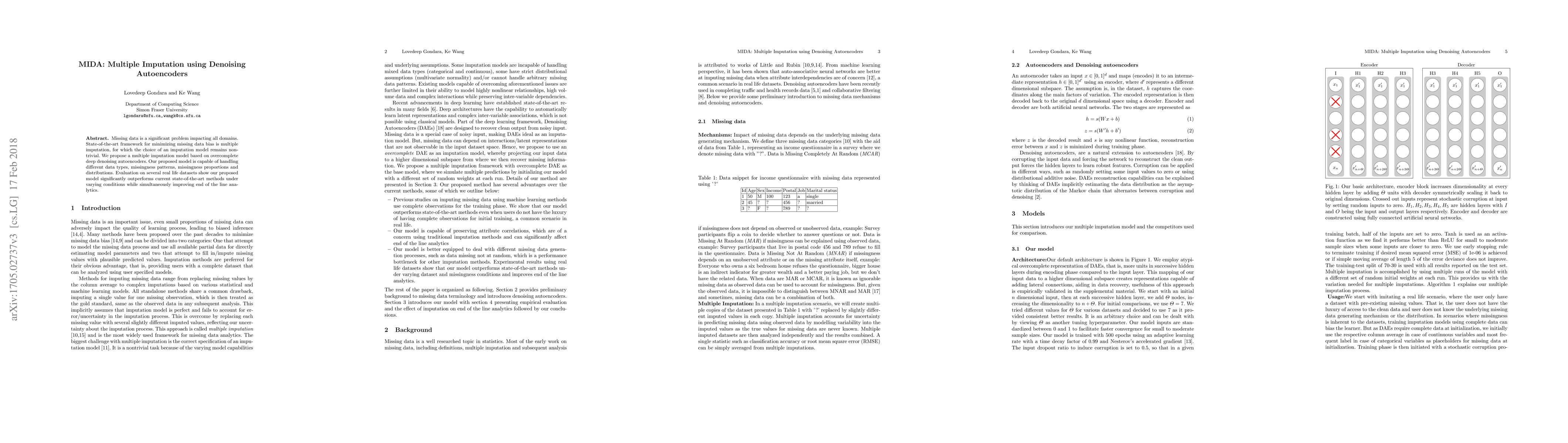 The paper proposes MIDA, a multiple imputation model using overcomplete deep denoising autoencoders to handle missing data across various types and patterns. Evaluations demonstrate that MIDA outperforms existing methods, enhancing both the imputation process and subsequent analytical outcomes.