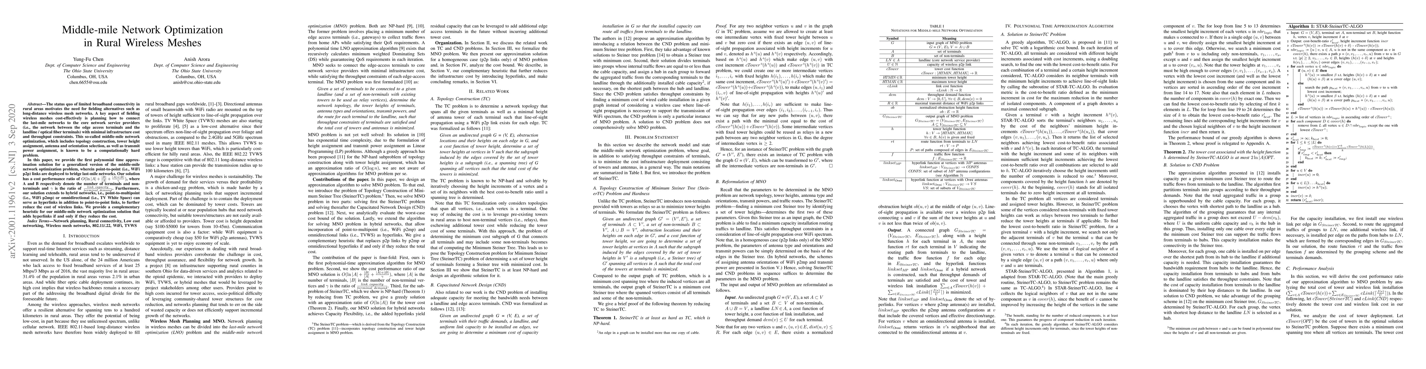 The status quo of limited broadband connectivity in rural areas motivates the need for fielding alternatives such as long-distance wireless mesh networks. A key aspect of fielding wireless meshes cost-effectively is planning how to connect the last-mile networks to the core network service providers (i.e., the network between the edge access terminals and the landline / optical fiber terminals) with minimal infrastructure cost and throughput constraints. This so-called middle-mile network optimization, which includes topology construction, tower height assignment, antenna and orientation selection, as well as transmit power assignment, is known to be a computationally hard problem. In this paper, we provide the first polynomial time approximation solution for a generalized version of the middle-mile network optimization problem, wherein point-to-point (i.e., WiFi p2p) links are deployed to bridge last-mile networks. Our solution has a cost performance ratio of $O(\ln{|A|}+\frac{|B|}{|A|}+\frac{|A|+|B|}{\gamma})$, where A and B respectively denote the number of terminals and non-terminals and $\gamma$ is the ratio of $\frac{link\ capacity}{terminal\ demand}$. Furthermore, our solution extends to hybrid networks, i.e., point-to-multipoint (i.e., WiFi p2mp) or omnidirectional (i.e., TV White Space) can serve as hyperlinks in addition to point-to-point links, to further reduce the cost of wireless links. We provide a complementary heuristic for our middle-mile network optimization solution that adds hyperlinks if and only if they reduce the cost.