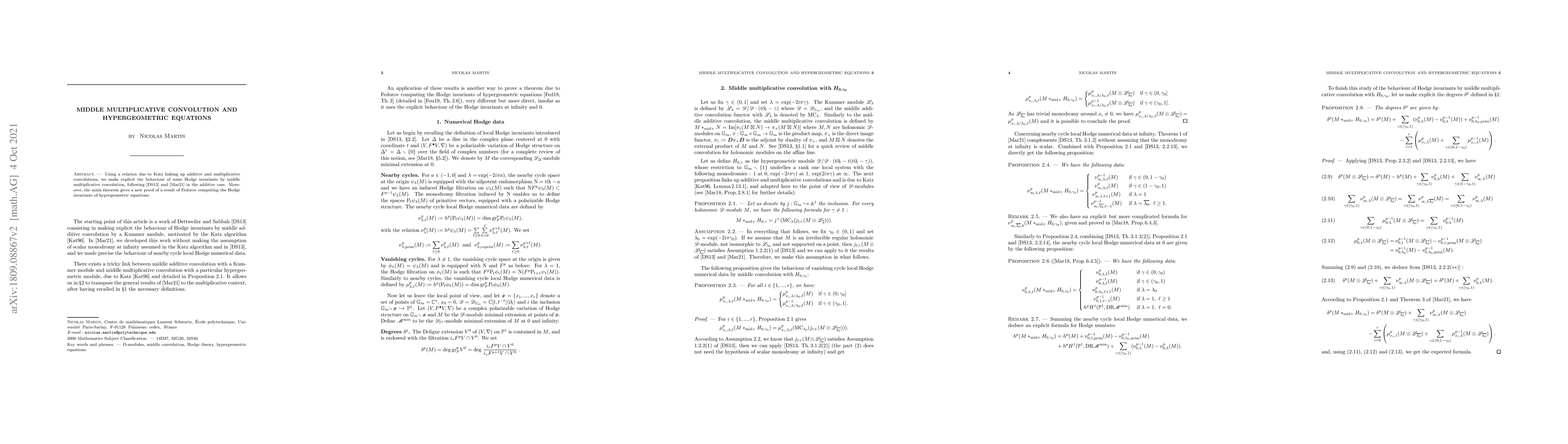 This paper explores the behavior of Hodge invariants via middle multiplicative convolution using a Katz relation, extending previous additive convolution results. It also provides a novel proof for Fedorov's computation of Hodge invariants in hypergeometric equations.