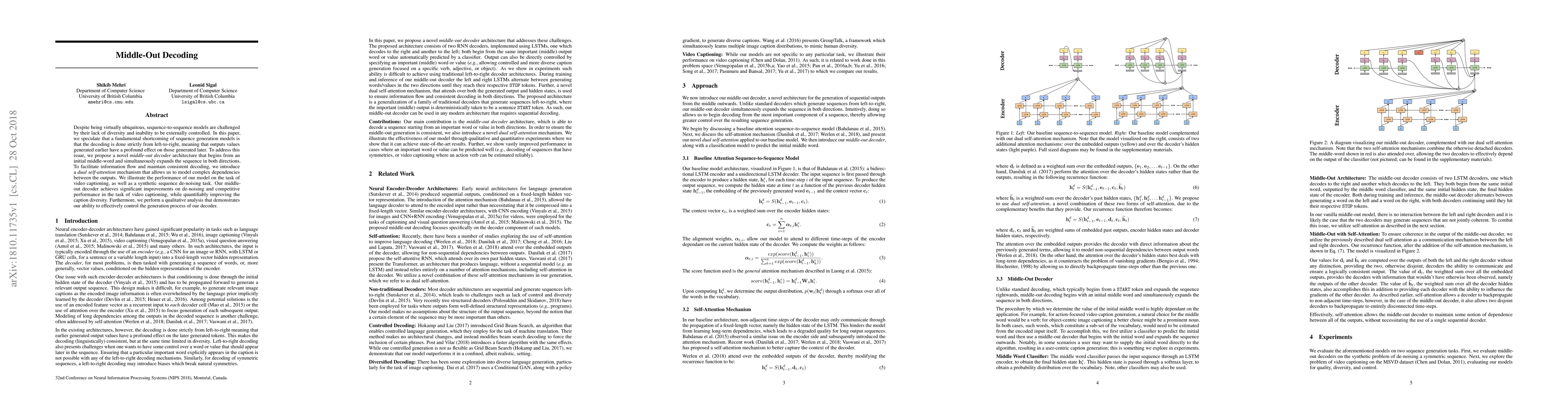 The paper proposes a middle-out decoding method for sequence generation models, addressing their left-to-right decoding limitations. This new architecture simultaneously expands sequences from the middle, improving output diversity and controllability in tasks like video captioning and sequence de-noising.