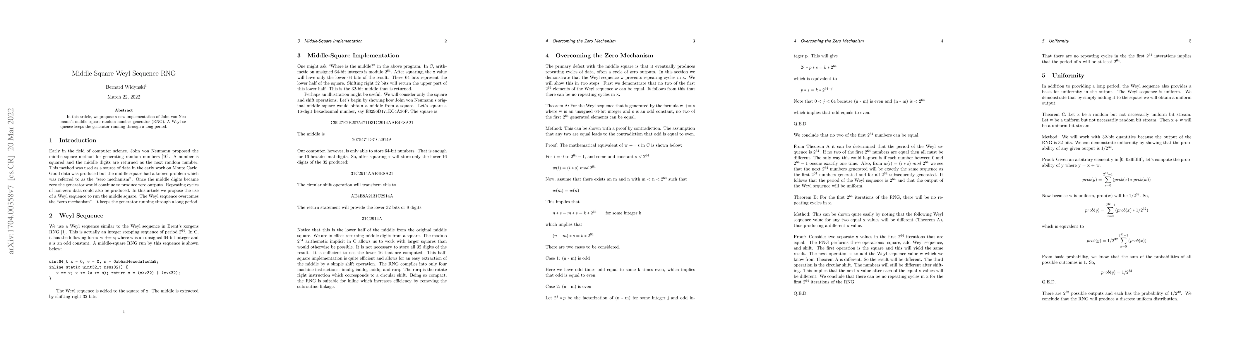 In this article, we propose a new implementation of John von Neumann's middle-square random number generator (RNG). A Weyl sequence keeps the generator running through a long period.