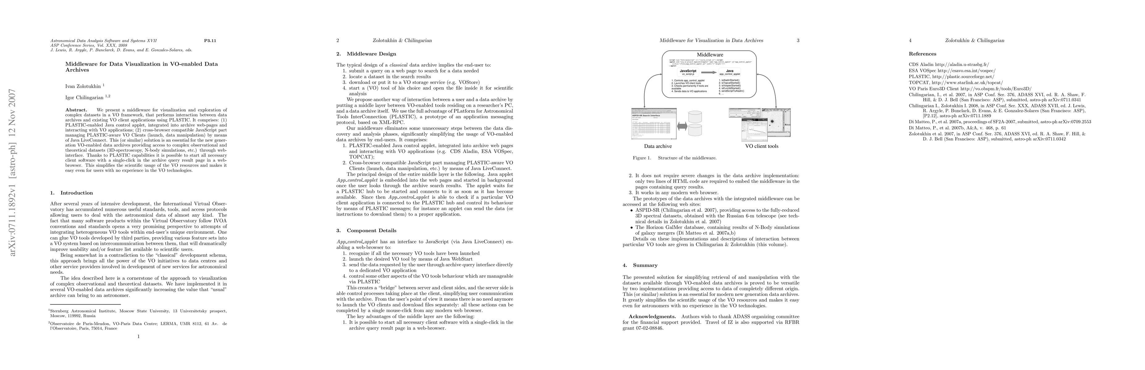 We present a middleware for visualization and exploration of complex datasets in a VO framework, that performs interaction between data archives and existing VO client applications using PLASTIC. It comprises: (1) PLASTIC-enabled Java control applet, integrated into archive web-pages and interacting with VO applications; (2) cross-browser compatible JavaScript part managing PLASTIC-aware VO Clients (launch, data manipulation) by means of Java LiveConnect. This (or similar) solution is an essential for the new generation VO-enabled data archives providing access to complex observational and theoretical datasets (3D-spectroscopy, N-body simulations, etc.) through web-interface. Thanks to PLASTIC capabilities it is possible to start all necessary client software with a single-click in the archive query result page in a web-browser. This simplifies the scientific usage of the VO resources and makes it easy even for users with no experience in the VO technologies.