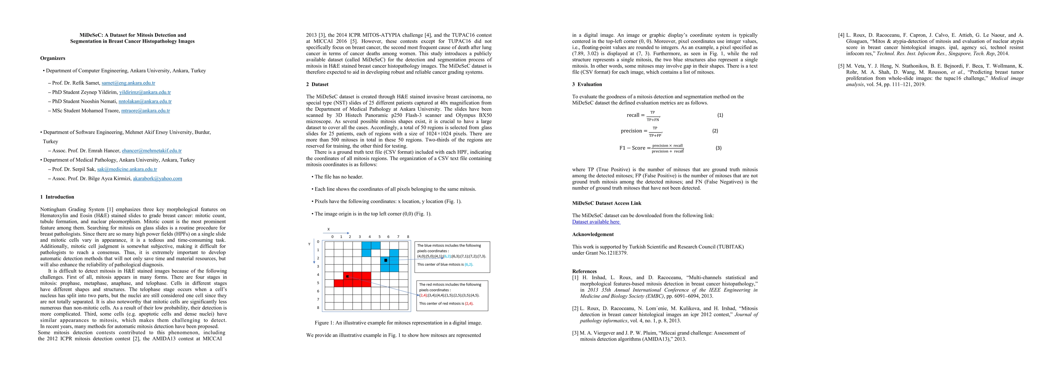 The MiDeSeC dataset is created through H&E stained invasive breast carcinoma, no special type (NST) slides of 25 different patients captured at 40x magnification from the Department of Medical Pathology at Ankara University. The slides have been scanned by 3D Histech Panoramic p250 Flash-3 scanner and Olympus BX50 microscope. As several possible mitosis shapes exist, it is crucial to have a large dataset to cover all the cases. Accordingly, a total of 50 regions is selected from glass slides for 25 patients, each of regions with a size of 1024*1024 pixels. There are more than 500 mitoses in total in these 50 regions. Two-thirds of the regions are reserved for training, the other third for testing.