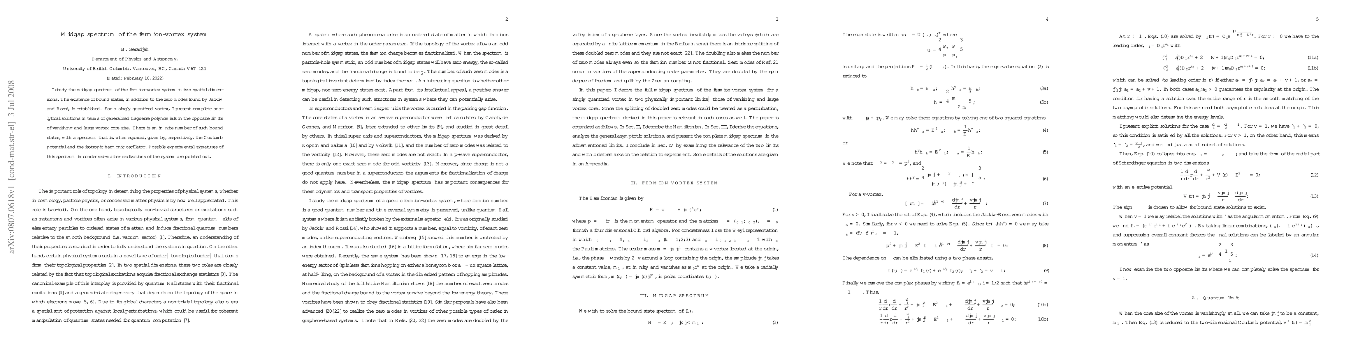I study the midgap spectrum of the fermion-vortex system in two spatial dimensions. The existence of bound states, in addition to the zero modes found by Jackiw and Rossi, is established. For a singly quantized vortex, I present complete analytical solutions in terms of generalized Laguerre polynomials in the opposite limits of vanishing and large vortex core size. There is an infinite number of such bound states, with a spectrum that is, when squared, given by, respectively, the Coulomb potential and the isotropic harmonic oscillator. Possible experimental signatures of this spectrum in condensed-matter realizations of the system are pointed out.