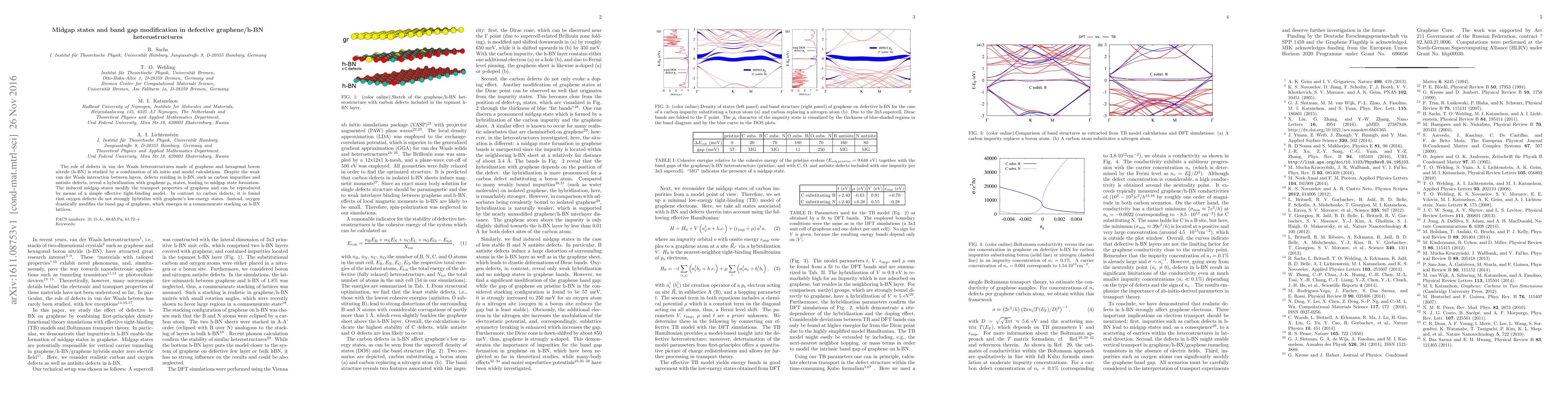 This paper investigates how defects in h-BN affect van der Waals heterostructures with graphene, finding that carbon impurities and antisite defects in h-BN create midgap states by hybridizing with graphene's p$_{\rm z}$ states, altering transport properties, while oxygen defects significantly modify the graphene band gap without strong hybridization.