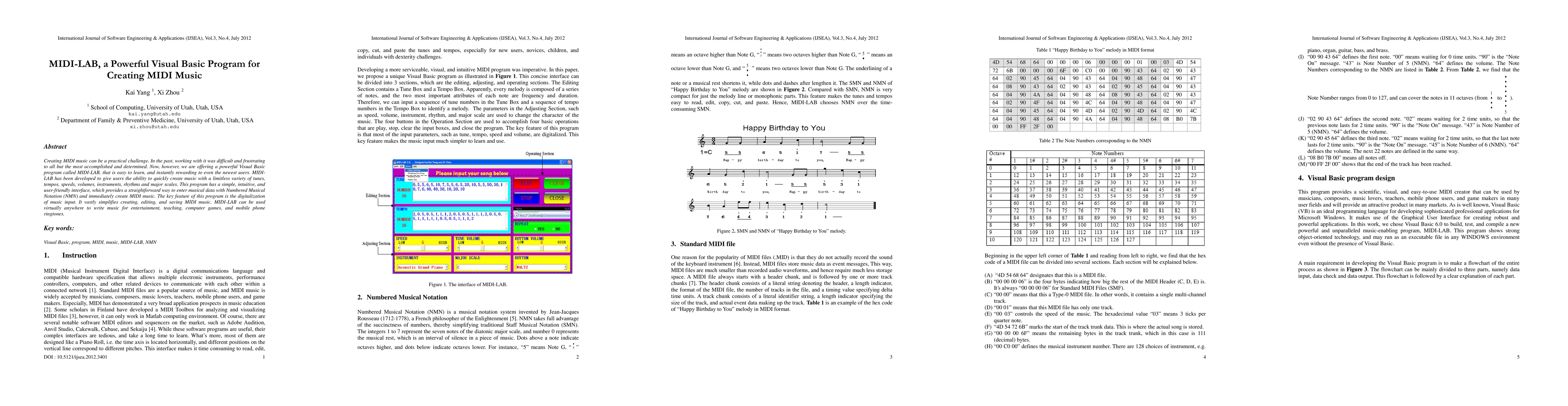 MIDI-LAB is a user-friendly Visual Basic program designed to simplify the creation of MIDI music, featuring an intuitive interface for easy entry of musical data and immediate MIDI music generation. It supports a wide range of musical elements and is versatile for various applications including entertainment, teaching, and mobile content.