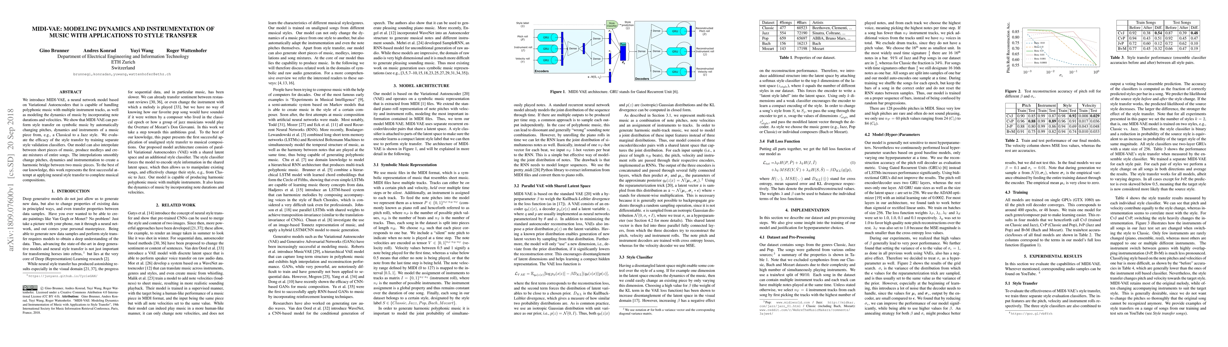 MIDI-VAE introduces a VAE-based architecture that models polyphonic music with dynamics, enabling style transfer and interpolation between musical pieces.